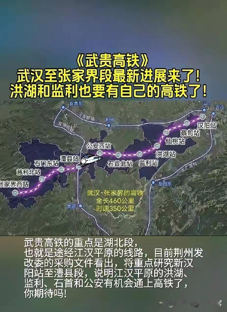 南线方案(湖北省主推):路线为武汉站→汉川→仙桃→洪湖→监利→湖南华容→石首→安乡→津市→澧县,接入呼南高铁澧县站,再经张家界至澧县高铁至张家界。 特点:覆盖洪湖、监利等高铁盲点地区,可结束两地无高铁历史,加强洞庭湖地区县市交流;但建设成本高、周期长(需新建仙桃至监利、监利至澧县等路段,且仙洪监铁路原规划为客货共线,升级为350km/h高铁需重新报批)。 进展:仙桃至监利段已纳入国家“十四五”铁路发展规划,但国铁集团否决了其升级为350km/h高铁的请求,目前处于前期研究阶段。
