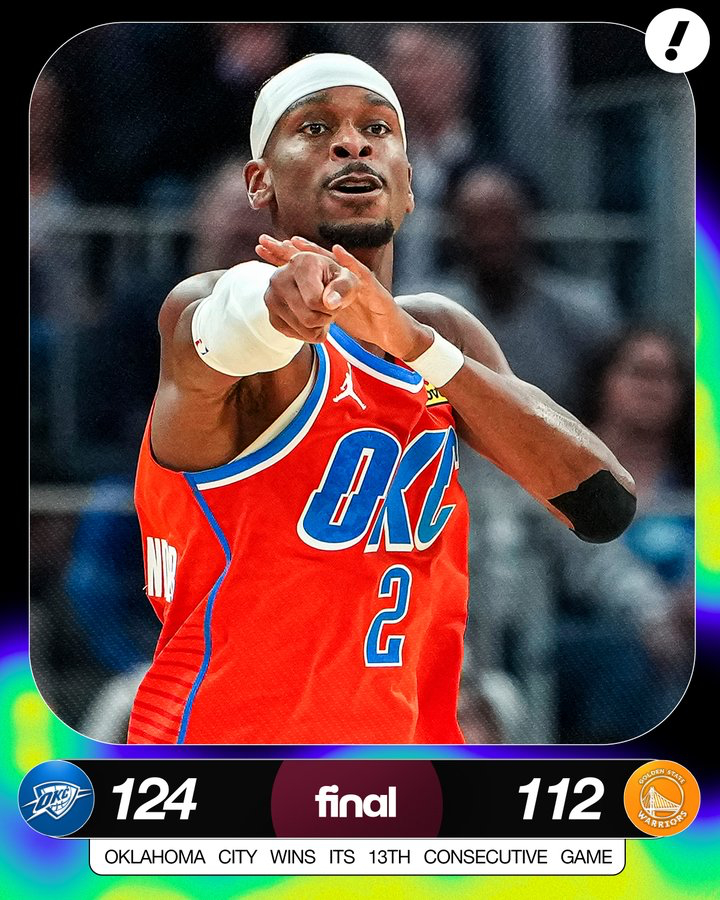 雷霆vs勇士任嘉伦预测nba总冠军 雷霆豪取13连胜无库勇士险些22分逆转雷霆雷霆拒绝勇士22分逆转,取得13连胜,战绩21胜1负,继续排名联盟第一,也是历史第四支前22场能赢下21场的球队,卫冕冠军的实力!亚历山大38分0失误,威廉姆斯22分6助攻,霍姆格伦21分8篮板;塞斯-库里勇士首秀,7中6贡献14分。