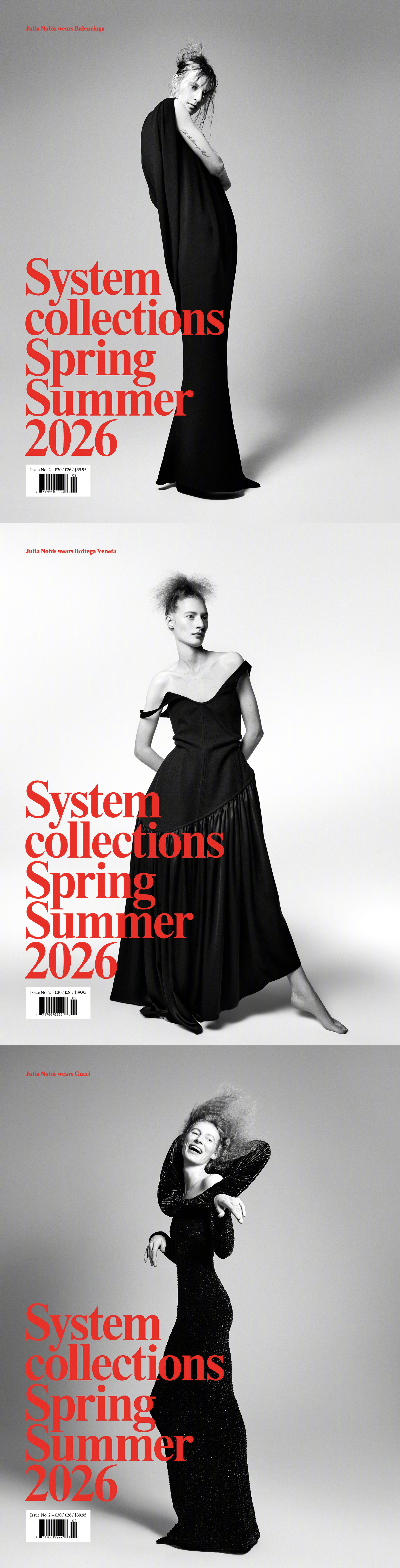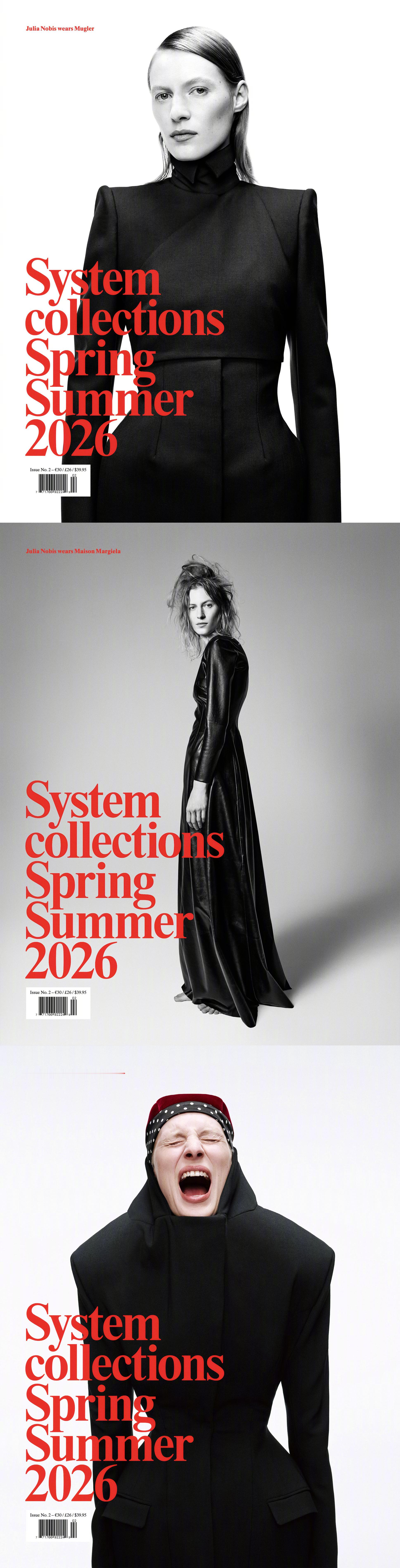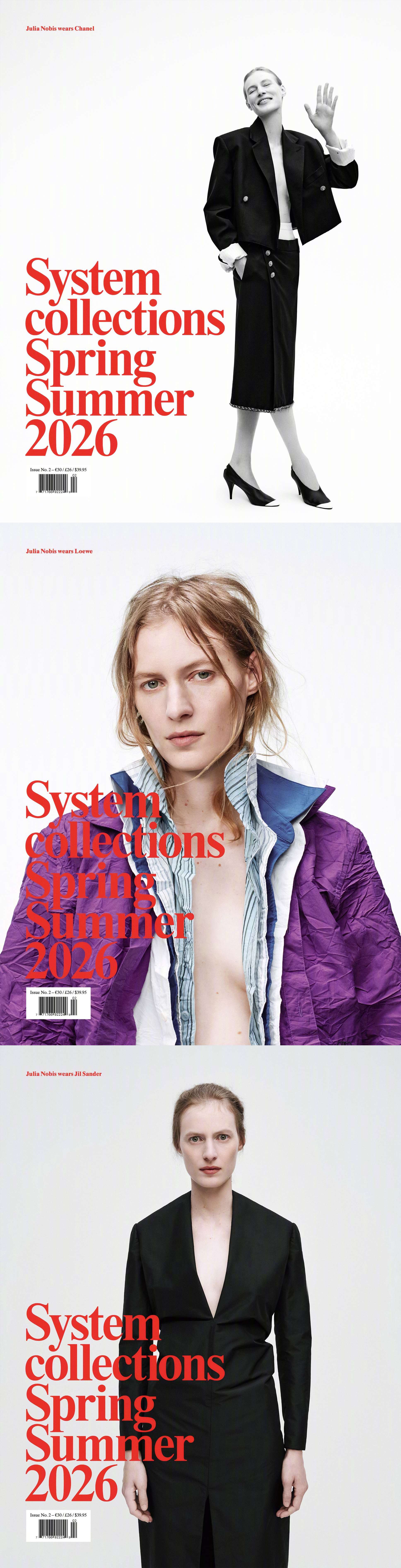 System Collections S/S 2026 春夏刊封面人物,超模Julia Nobis 一人12张封面,演绎26春夏新季服饰,内页还有男模Jesse Rinderknecht参与拍摄,简洁冷调的时装片风格。摄影: Willy Vanderperre