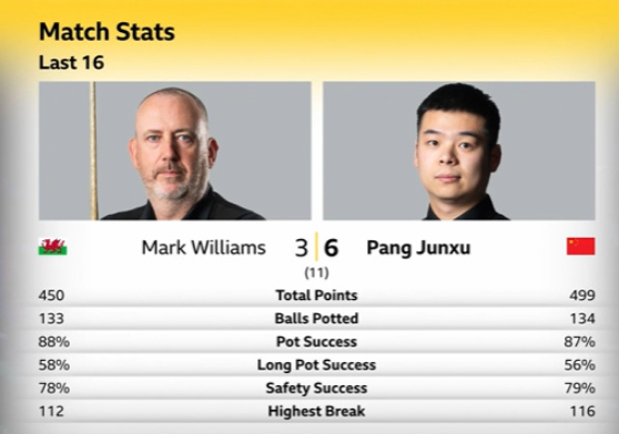 全场比赛马克·威廉姆斯打出单杆101、112分,庞俊旭打出单杆76、53、116分。开局庞俊旭一路扩大领先优势,一度4-1领先威廉姆斯,威廉姆斯第六局轰出112分破百连追两局,将比分追到3-4,随后庞俊旭打出单杆51、116分锁定胜局,以6-3的比分战胜威廉姆斯,成为首位晋级八强的中国球员!