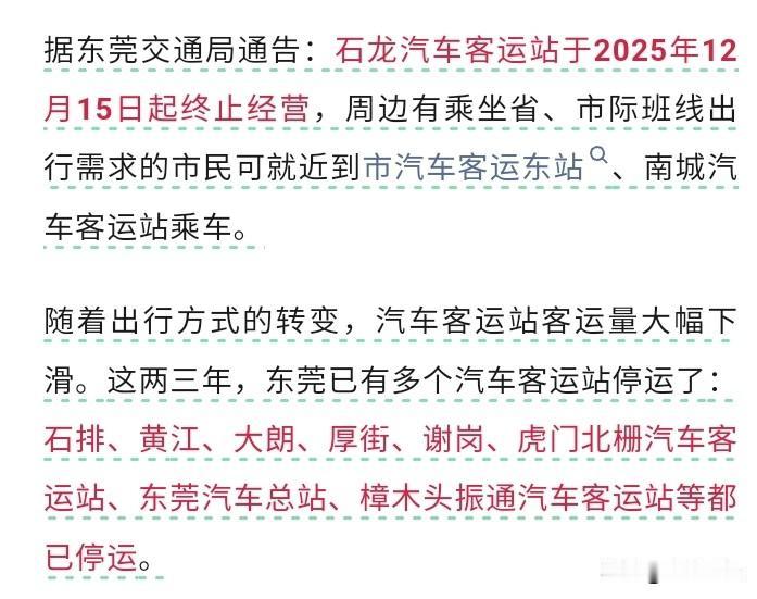 东莞又一大巴客运站关闭!可惜!人口超过一千万的东莞,最近几年陆陆续续关闭了多个客运站,包括东莞总站、石排、黄江、大朗、厚街、谢岗等10个客运站都关闭了!东莞曾经几十个汽车客运站,目前仅剩汽车东站、南城站等几个客运站了! 曾经一票难求,曾经人山人海的东莞各大客运站,变得门可罗雀!高铁、私家车、网约车的冲击是对大巴客运最大的影响! 东莞石龙客运站位于石龙西湖,东莞站的旁边,莞龙路,地理位置优越,曾经石龙客运站的大巴可以直达广东广西湖南江西等多个省市,如今“门前冷落鞍马稀”,一个时代的结束!有多少人的青春就在了这里!大巴客运究竟做错了什么? 客运站倒闭 东莞客运北站 石排客运站 大朗汽车客运站 石排汽车站 大朗车站停运 东莞大朗汽车站 东莞长平汽车站 东莞塘厦汽车站 东莞大巴攻略 凤岗镇客运站 东莞长途客运 凤岗客运站 东莞黄江汽车站 东莞汽车客运