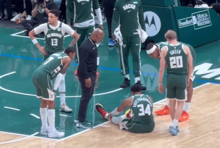 雄鹿球员扬尼斯-阿德托昆博首节遭遇右小腿拉伤,提前退出比赛。
