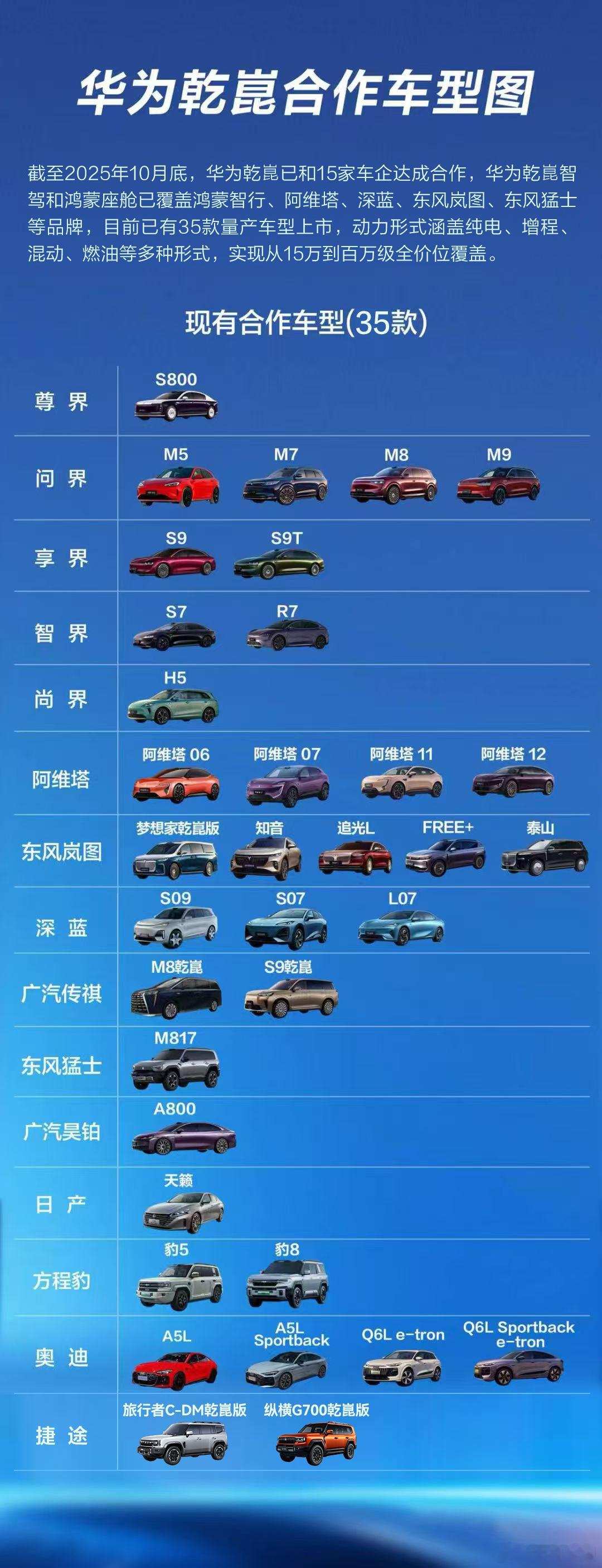 买车就买乾崑智驾以前买车,智能化是添头,有最好,没有也能开。但你看看华为乾崑智驾数据月报每个月都在稳步提升的数据,就能看出一个现象,大部分用户只要用了就会爱上华为乾崑。证明就是光 11 月车位到车位2.0功能就用了 509 万次,用户敢于在最复杂的停车场、闸机、窄路这种高频痛点场景使用,其实力应该不用我多说了。更重要的一点是,它的数据一直在涨,能力一直在通过OTA进化。你买别的车,提车那天就是它的巅峰,你买华为乾崑智驾,提车那天只是个开始。同时华为乾崑现在有35款合作车企的量产车型,从十几万的深蓝到百万级的尊界,从轿车到硬派越野。这意味着它见过最多样的底盘动态、最跨度的用户习惯。随着每个月训练里程的增加,你的车会越来越老练,越来越懂路,也越来越好用。