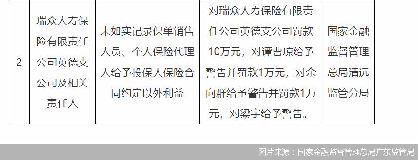 北京商报讯(记者李秀梅)12月4日,国家金融监督管理总局广东监管局发布行政处罚信息显示,瑞众人寿保险有限责任公司英德支公司,因未如实记录保单销售人员、个人保险代理人给予投保人保险合同约定以外利益,被罚款10万元;相关责任人谭曹琼、余向群分别被警告并罚款1万元;梁宇被警告。