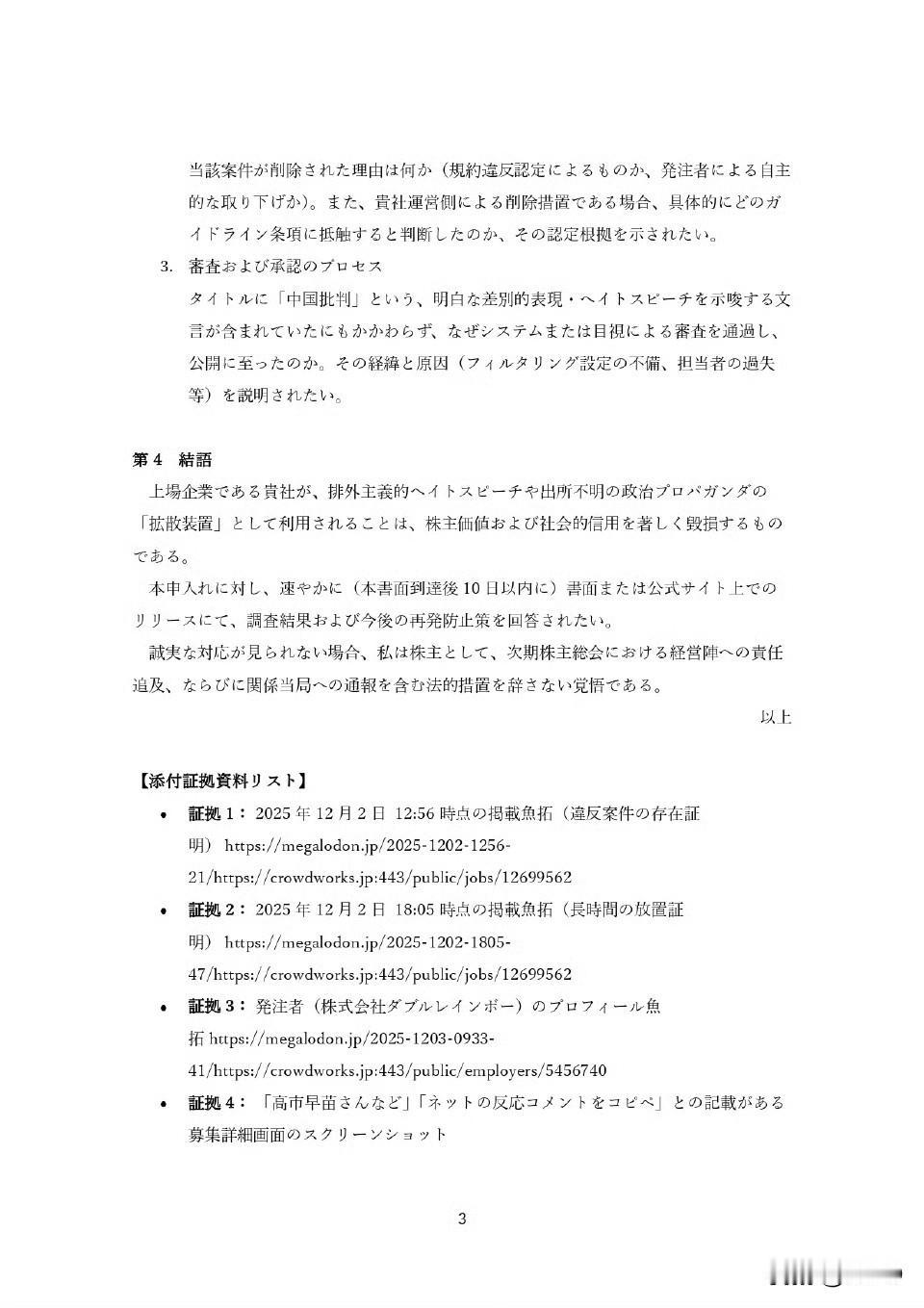 一名日本律师和日本外包平台株式会社 CroudWorks 的股东,发律师函要求该