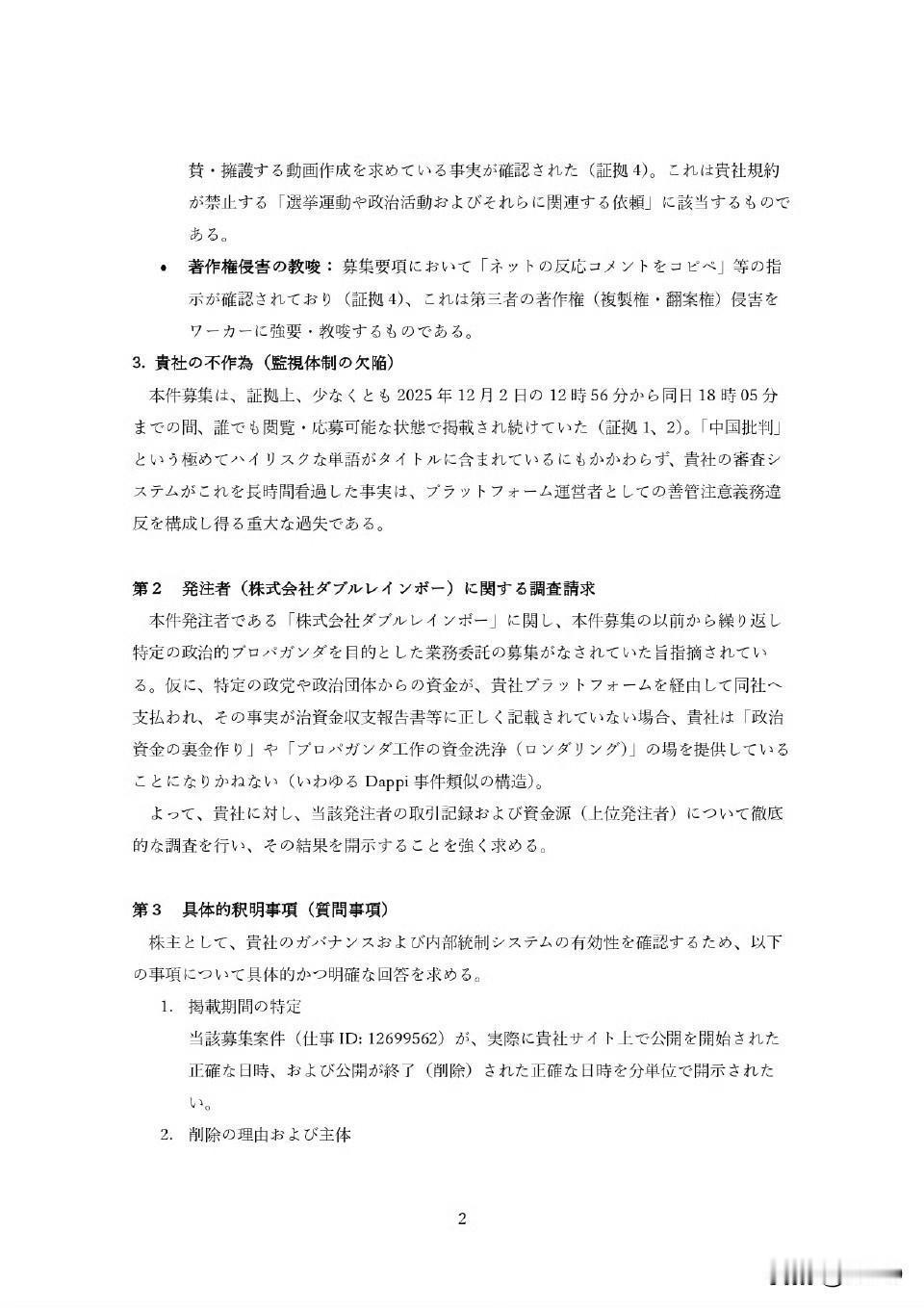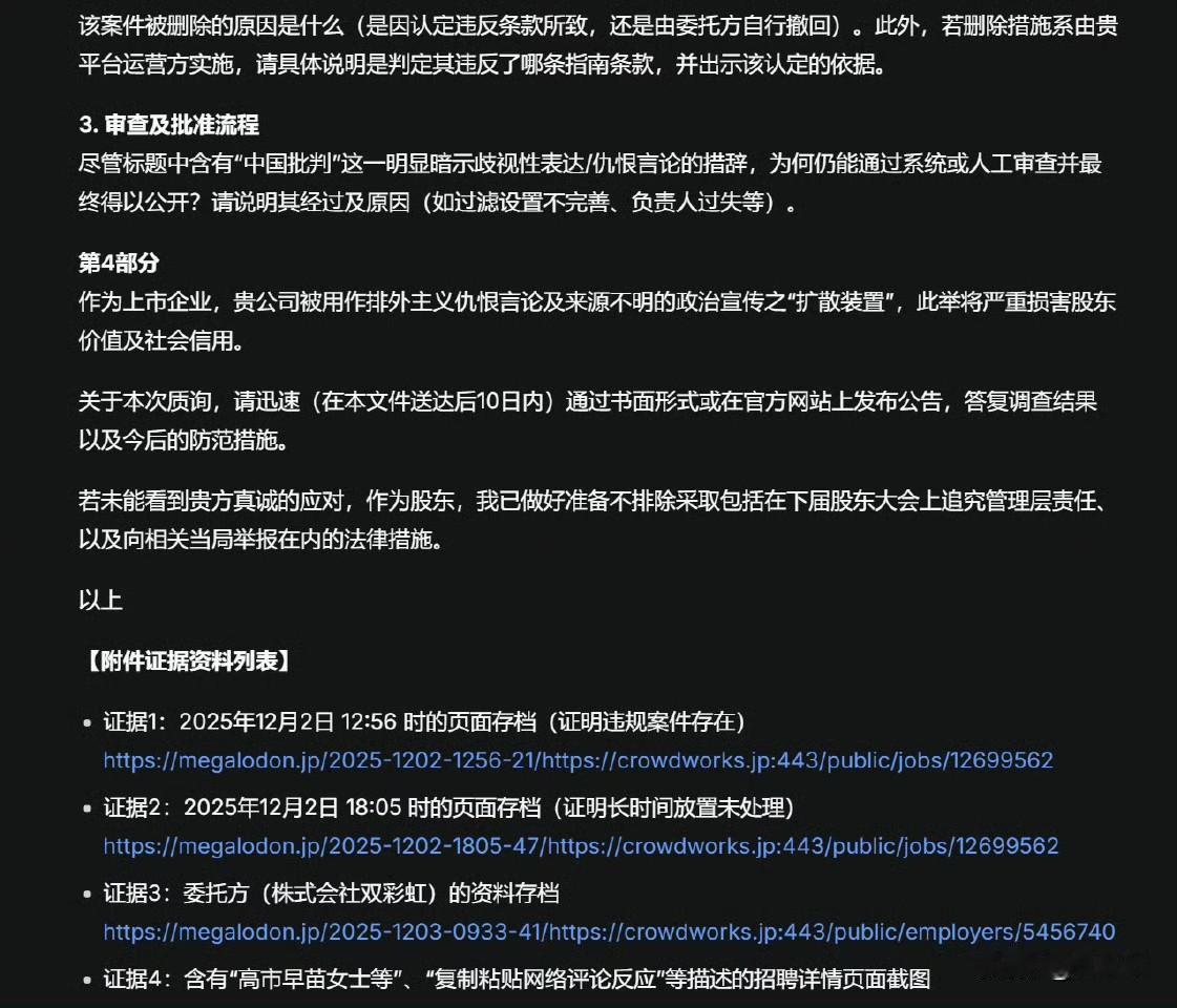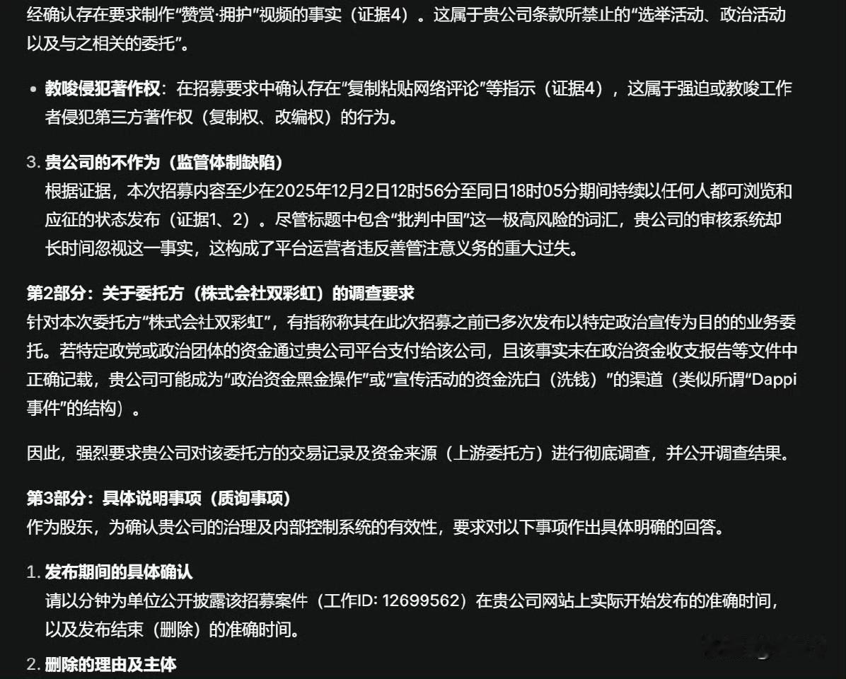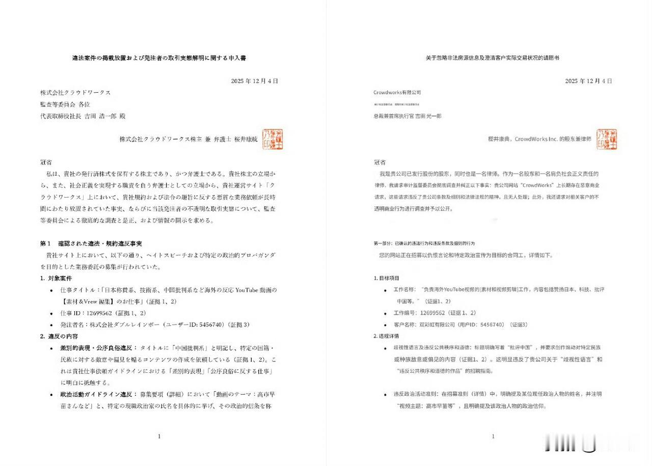 一名日本律师和日本外包平台株式会社 CroudWorks 的股东,发律师函要求该平台公布“招募制作抹黑中国视频”相关发布企业、资金来源、任务发布审核流程、平台责任人等相关信息。