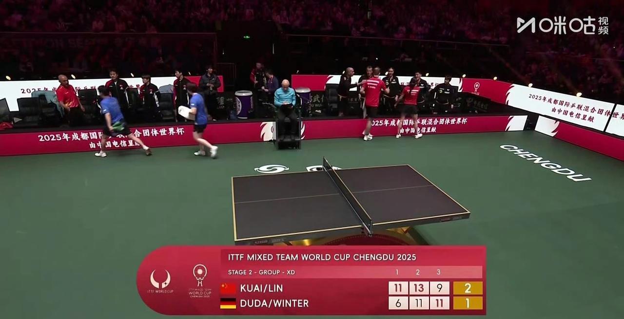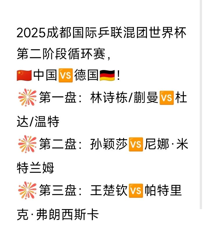 第二局栋曼组合从0-7追到13-11拿下[赞][奋斗]! 最终第一盘林诗栋/蒯曼2-1完胜杜达/温特,三局比分为:11-6,13-11,9-11。 对手温特打得真好,很多球都能打上,威胁性很大,栋曼组合也打得很不错了。 中国队越往后越难打了,杜达、温特也不是无名之辈,尤其温特是特殊打法,栋曼组合不好对付她。 这是2025成都混团世界杯第二阶段循环赛,目前中国队2-1领先德国队! 评论区继续播报战况哦[奋斗]! 第二盘孙颖莎对阵妮娜!莎莎加油[奋斗]!