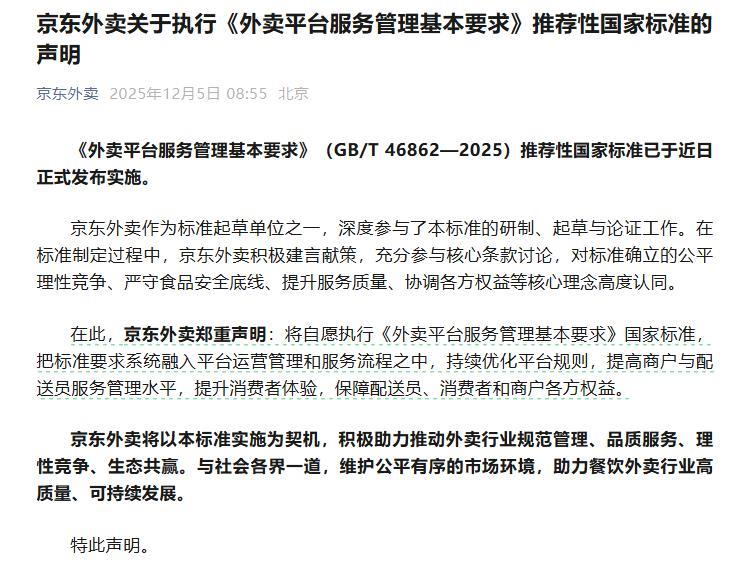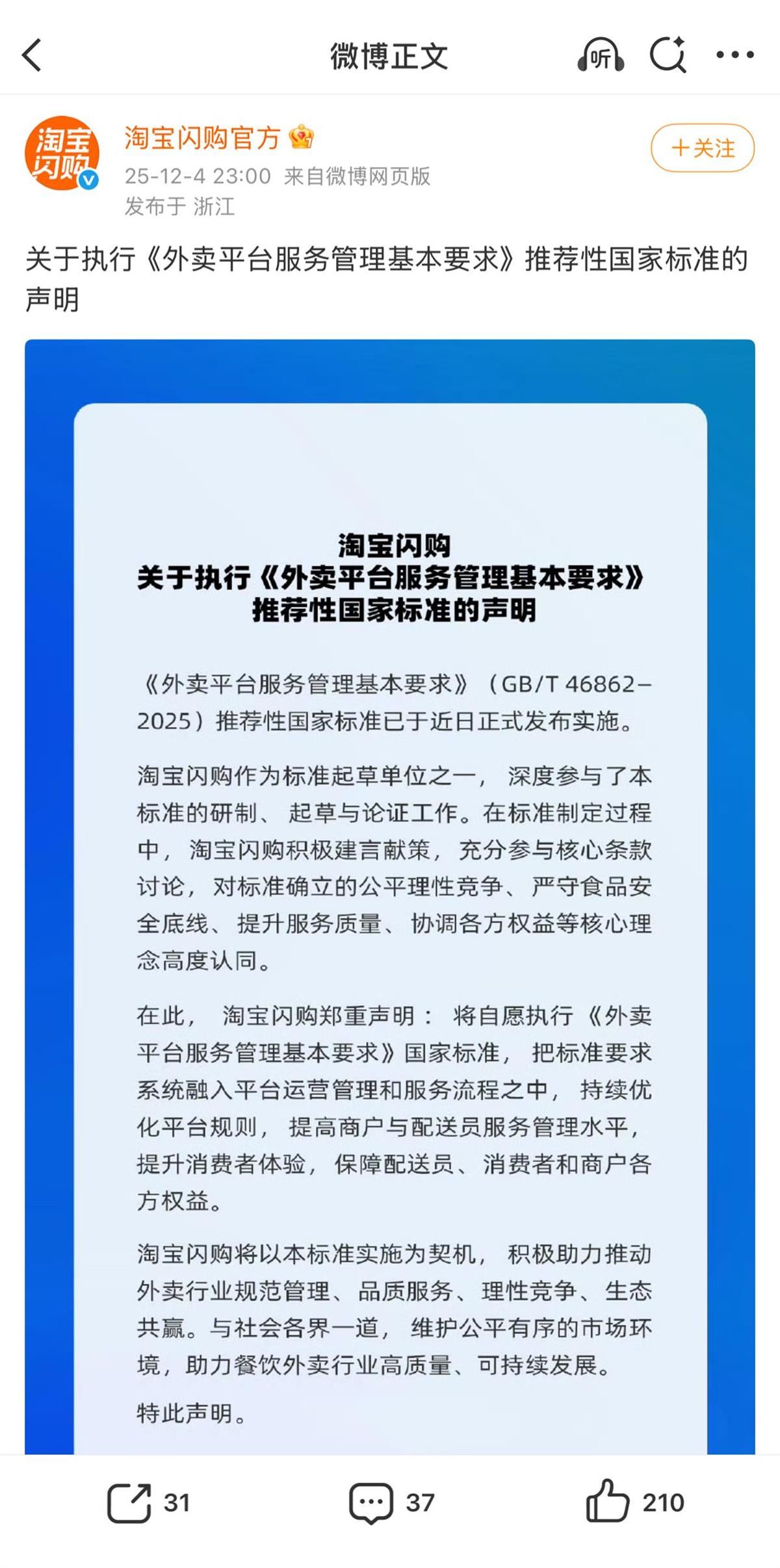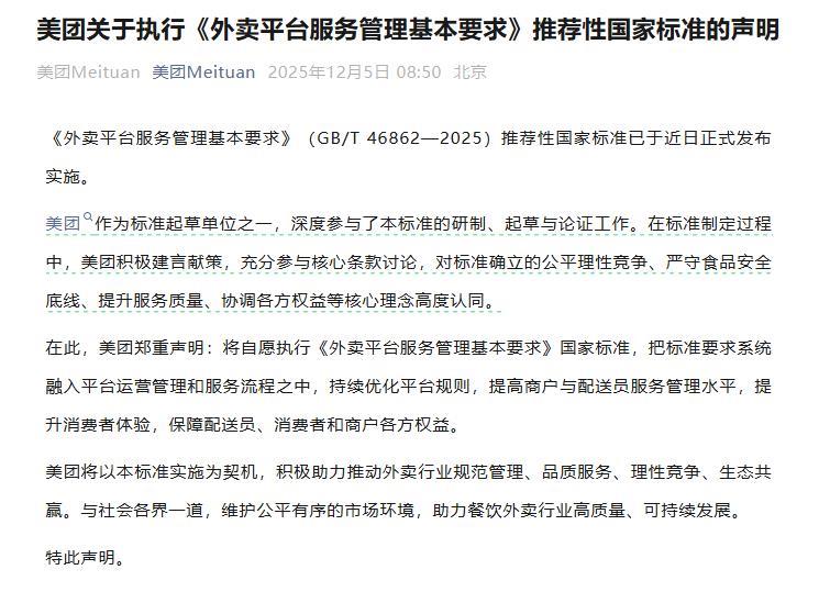 外卖平台推荐性国家标准《外卖平台服务管理基本要求》已于近日发布实施。12月4日、5日,淘宝闪购、美团、京东外卖相继通过各自平台发布声明称,将自愿执行《外卖平台服务管理基本要求》国家标准,把标准要求系统融入平台运营管理和服务流程之中,持续优化平台规则,提高商户与配送员服务管理水平,提升消费者体验,保障配送员、消费者和商户等各方权益。