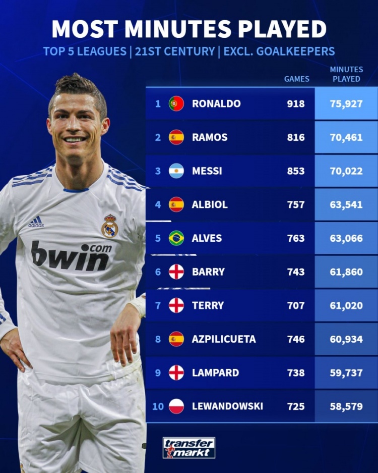 21世纪五大联赛非门将出场时间榜:C罗居首,拉莫斯、梅西前三