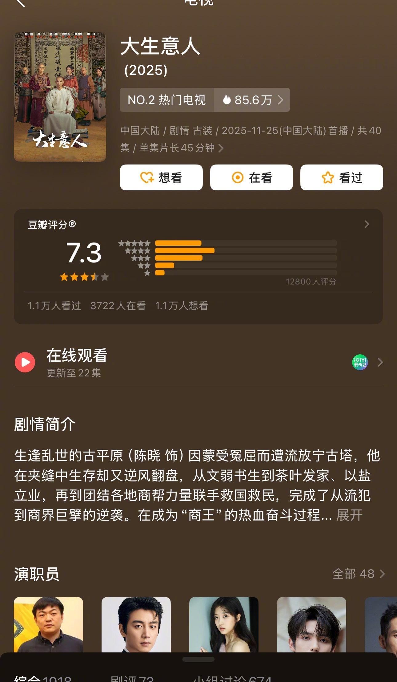 迪丽热巴陈星旭《枭起青壤》豆瓣开分6.3陈晓孙千《大生意人》豆瓣开分7.3高了还是低了?