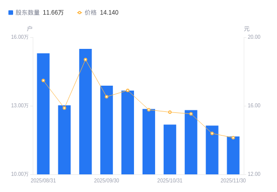 日期A股户数(户)流通A股户均持股数(股)户均持股市值(万元)2025-11-301166213314.094.692025-11-201213293185.494.582025-11-101281253016.534.682025-10-311217693173.984.962025-10-201286183004.974.742025-10-101366922827.474.782025-09-301388102784.334.602025-09-191549242494.734.672025-09-101302252967.894.712025-08-311529752526.514.42