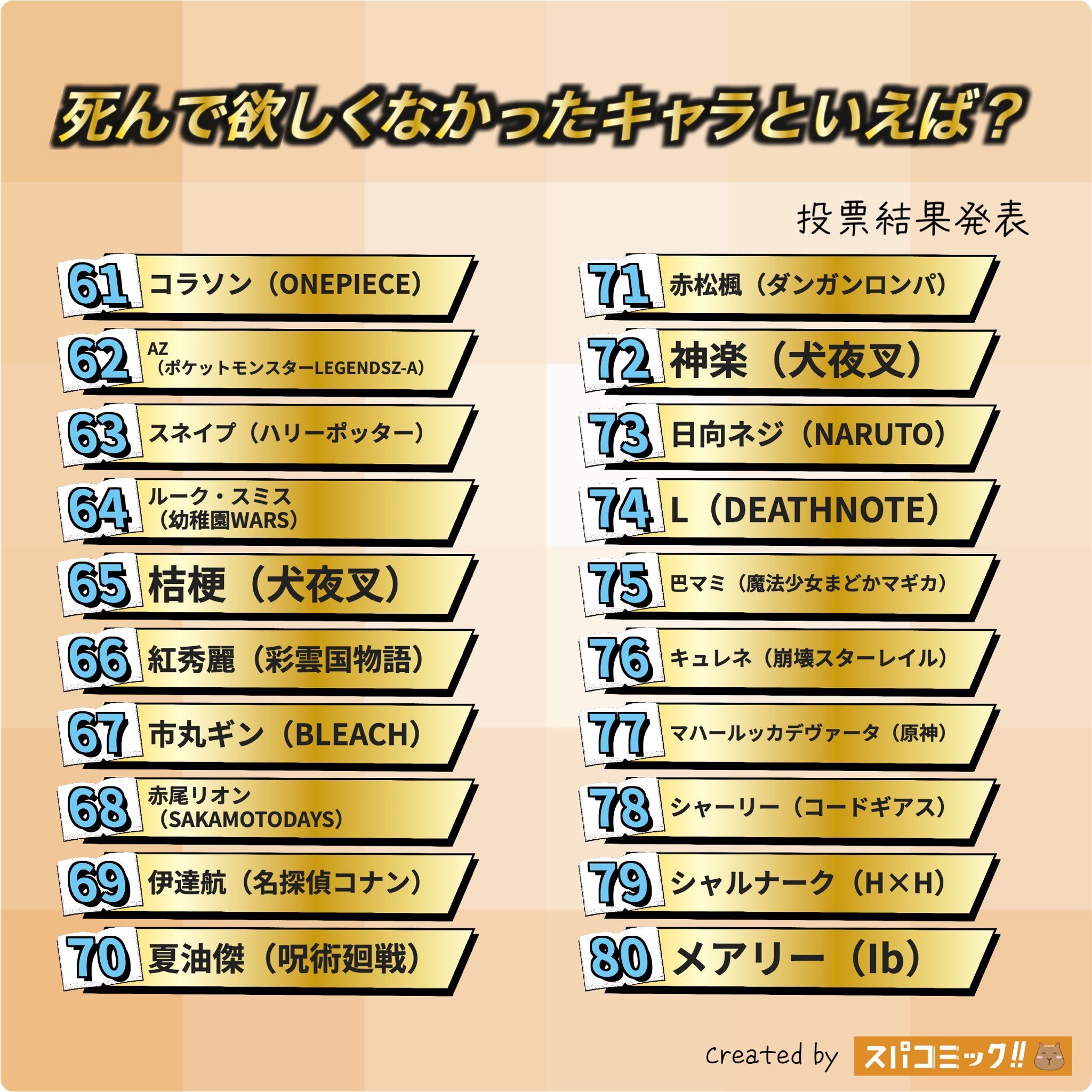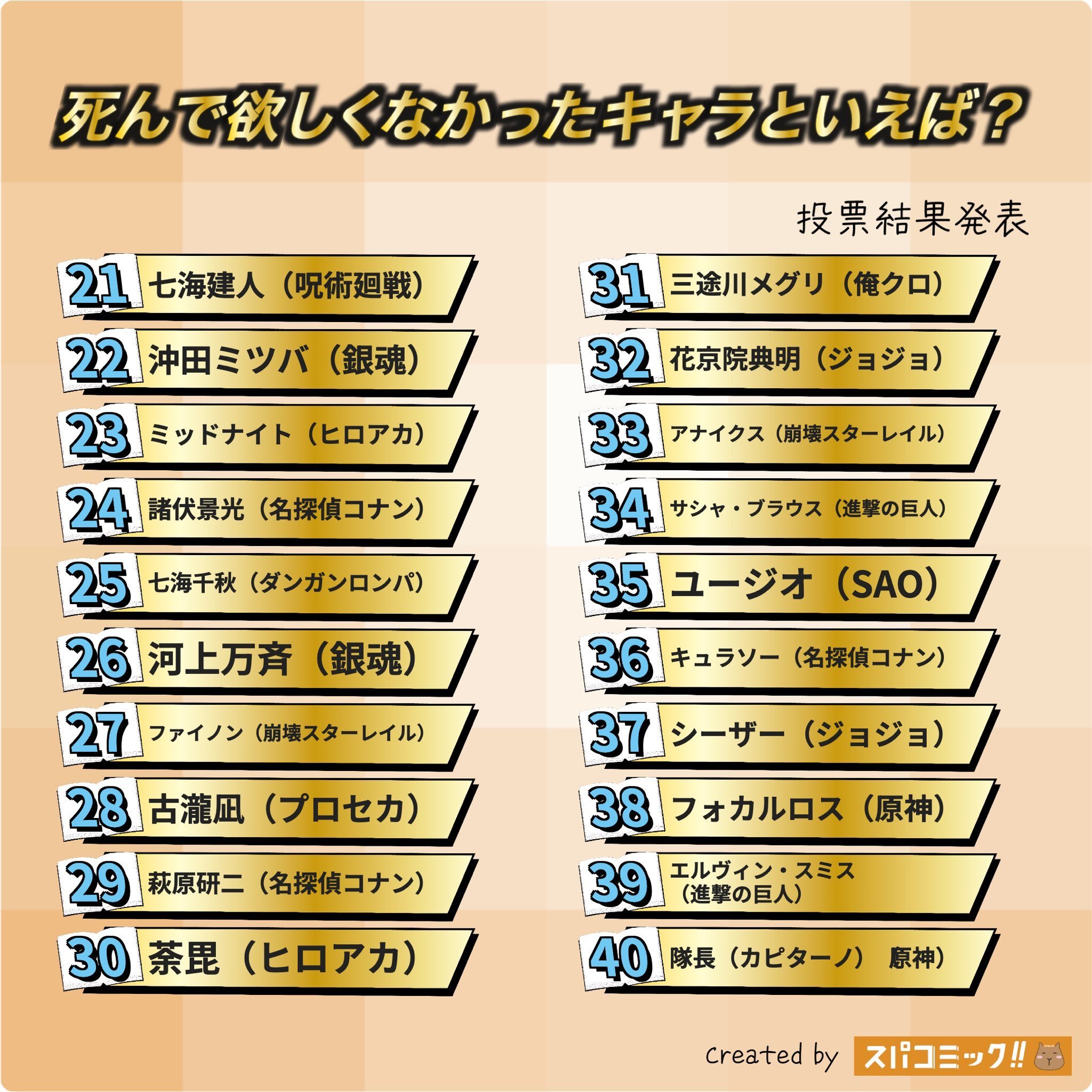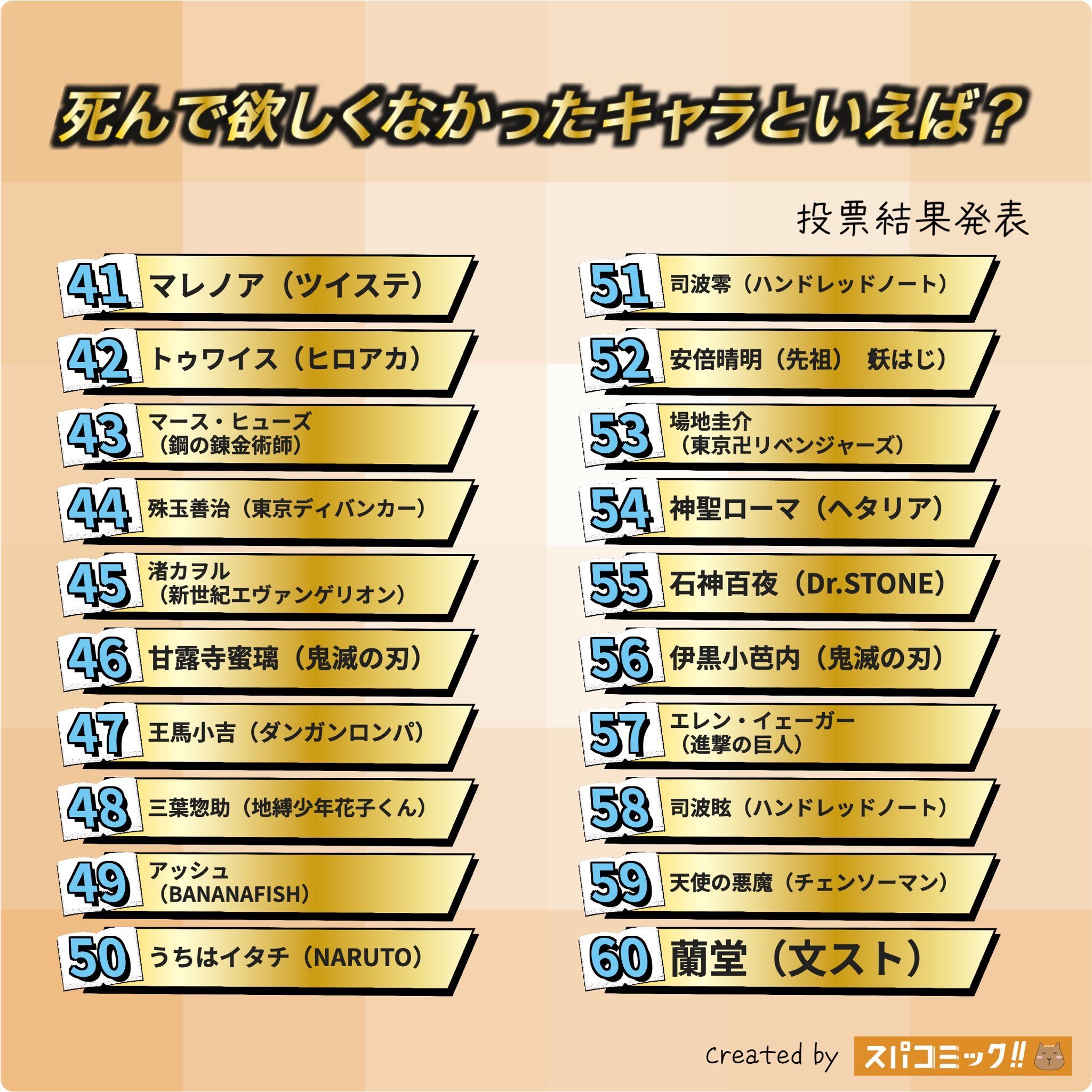 最不希望去世角色排名前一百:前十分别为:高杉晋助、杀老师、 蝴蝶忍、 织田作之助、 炼狱杏寿郎、德川茂茂、 五条悟、 时透无一郎、 松田阵平、早川秋、