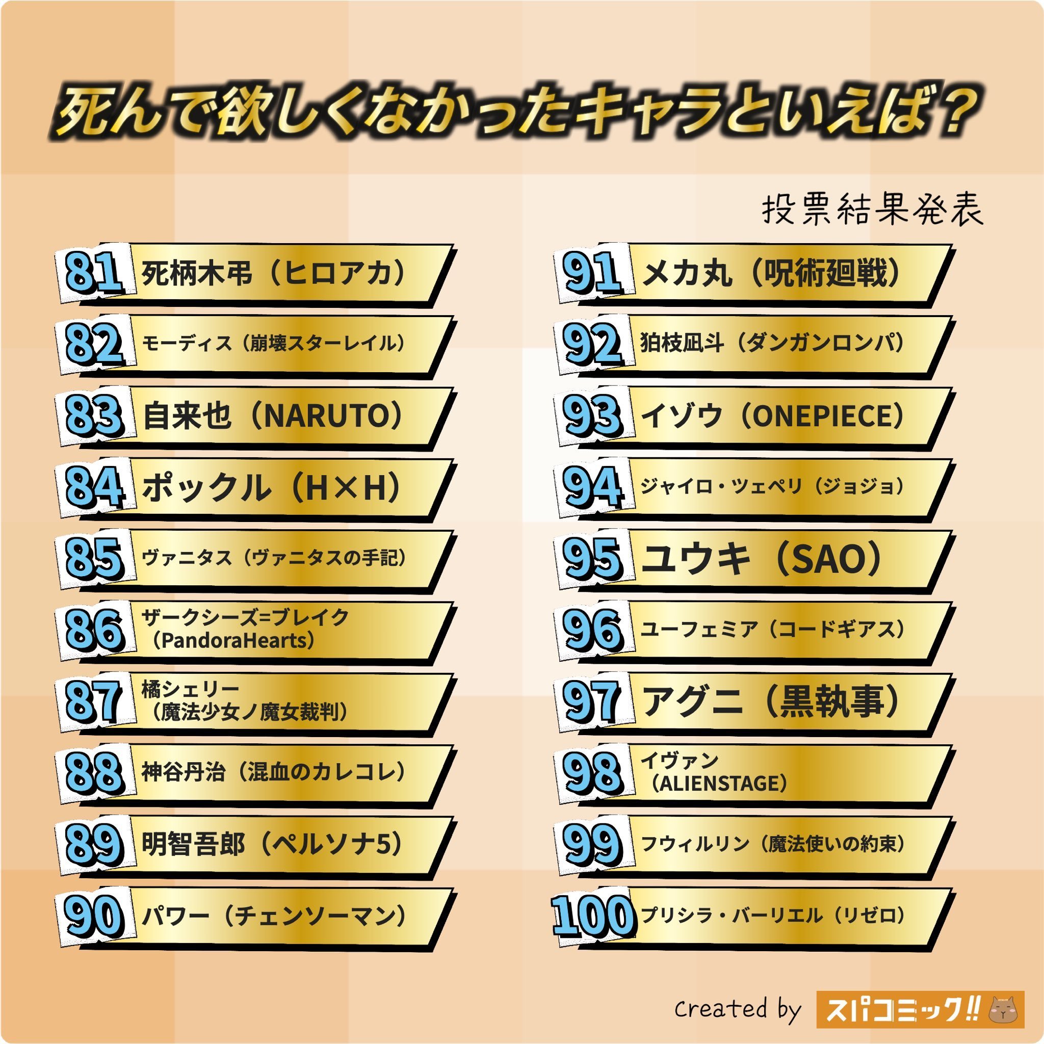 最不希望去世角色排名前一百:前十分别为:高杉晋助、杀老师、 蝴蝶忍、 织田作之助
