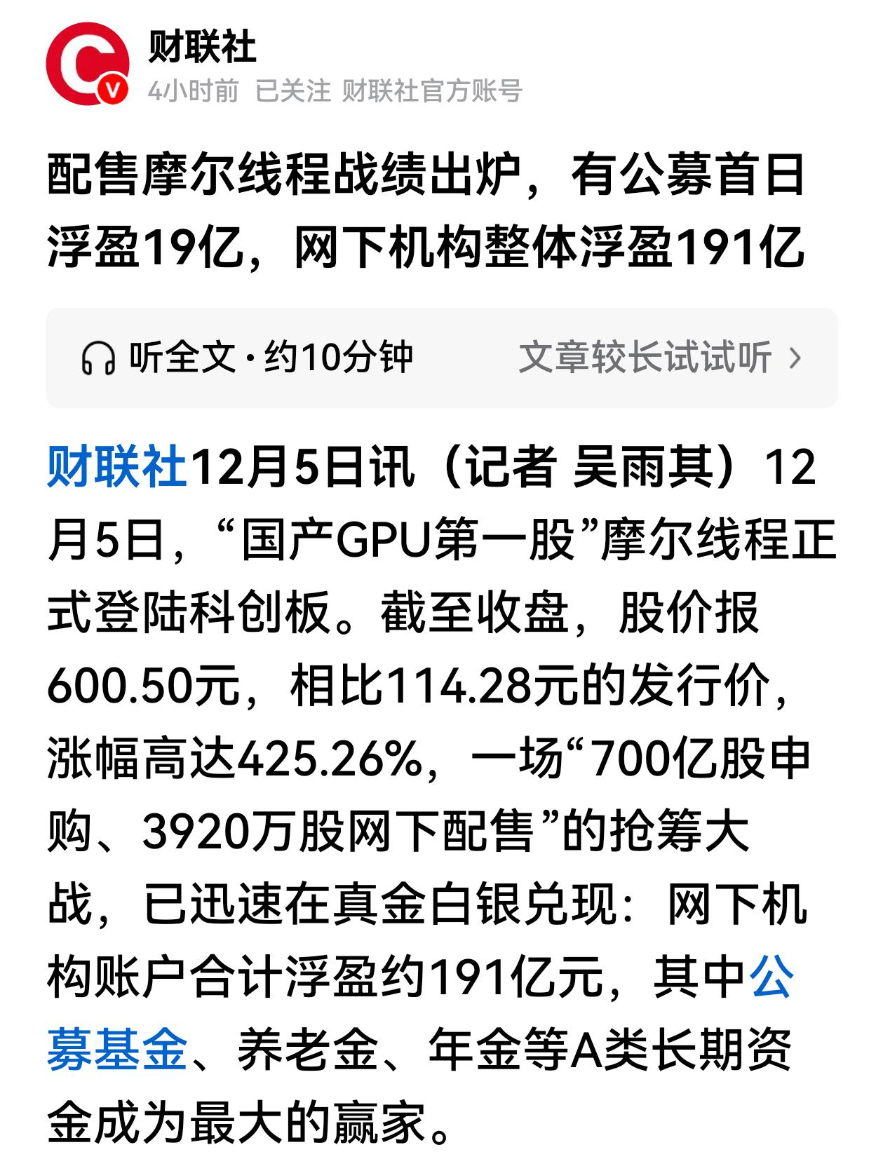 昨天摩尔线程上演完美首秀,股价直接较发行价翻了5倍,市值直接冲上了3000亿。这边人们满怀自主GPU的情怀,围观着这场资本市场的盛事,那边投资人轻举酒杯,畅饮这场资本市场的盛宴。 3000亿对于局外人就是一组数字,对大小股东而言,那就是真金白银的财富。 收获最大的当然是Pre—A投资人,“沛县乾曜”基金,以投前估值1000万元,1元/注册资本的价格,投资了190万,上市前持股1699.87万股,占比3.62%,五年的时间,回报超过6000倍; 深圳明皓,以投前估值4.2亿,35.28元/注册资本的价格完成投资,股权多次转让,上市前持股1992.27万股,占比4.24%,投资翻了20倍。 易方达基金获网下配售383.73万股,5倍收益,浮盈超过19亿亿元,网下机构整体浮盈191亿元; 量化及多头私募是B类主力,也中签2—6万股,浮盈也是千万级别的。 网上中签率才0.036%,中签如同买彩票,幸运儿中一签开盘就卖掉,账面轻松盈利26.78万元,这在二级市场是不可能完成的任务。 短期来看,股价能否站稳600元尚难讲,毕竟估值比较高,今年14亿的收入,预期2027年才能盈利,机构预测上市1000亿左右市值,现在首日就达3000亿市值了,一日就制造如此大的浮盈,先期投资人已赚得盆满钵满,相信不少投资者会择机获利退出,有些机构可能是押注摩尔线程的中长期,但不是所有人都愿意承受更长期的持仓波动,所以短期下跌的概率是很大的。 这无疑是顶级的成功投资案例,不过从创业来看,这才是刚开始。在投资大的叙事方面,摩尔线程肩负自主GPU突围、改写全球算力竞争格局的重任,目前填补英伟达退出的空白,营收暴涨性增长,定位高估值有合理性。但现实是其产品性能相当英伟达上代产品,填补国产AI芯片空白也面临竞争,华为芯片独大,据机构分析,其占到65%的份额,百度昆仑芯明年会增长60%,其他的有寒武纪,海光信息,再就是摩尔线程、沐曦股份这4小龙,中国市场能支持几个5000亿乃至万亿市值的AI芯片公司?这需要公司在竞争中成为赢家才行。 寒武纪的市值增长有代表性,在实现盈利的时候达到3000亿,在业绩爆发时达到5000亿。现在摩尔线程的市值已经3000亿了,如果2028年是业绩爆发时点,市值达到5000亿元以上,那也只有70%左右的上升空间,现价的吸引力并不大,选择这个价格接盘的不会多,看好摩尔线程未来的,还是等股价回踩后上车较安全。