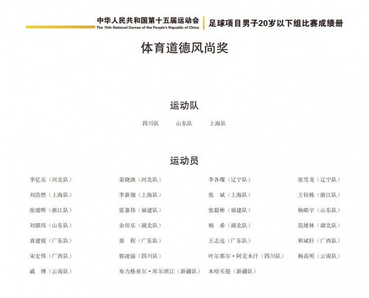 十五运会已经落下帷幕,根据赛事官网成绩册,四川U20男足、山东U20男足、上海U20男足获得体育道德风尚奖。