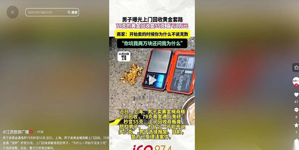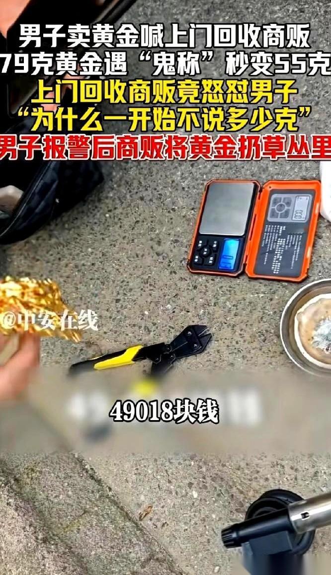 家里的79克黄金,放别人秤上,一秒钟就变成了55克。 凭空“蒸发”了24克,两万多块钱。 最骚的操作是,对方不等你反应过来,四万九千块钱“唰”地一下就给你转过来了,还摆出一副“我够爽快吧,赶紧收钱”的嘴脸,想把这事儿做成既定事实。 这就是现在最野的上门收黄金套路。 赌的就是你家里没秤,或者你脸皮薄,就算心里犯嘀咕也不好意思当场掰扯。 可惜啊,这次的骗子,一脚踢在了钢板上。 这位大哥是个明白人。人家上门前,自己在家拿小秤称得清清楚楚,心里早就有底了。 看到克数不对,大哥心里门儿清,不动声色。等钱到账,证据链完整了,才不慌不忙地摊牌。 结果你猜怎么着? 那收黄金的被当场戳穿,不光没半点心虚,还恼羞成怒,倒打一耙,冲着大哥吼: “你为什么一开始不说有多少克?!” 我听着都快气笑了。 这强盗逻辑翻译过来不就是:“你要是早点告诉我正确答案,我就抄得像一点儿了,不至于错得这么离谱,让我当场出糗。” 小偷被抓,还怪主人没把门锁好。 简直了。 后面的事就舒服了。想跑?门儿都没有。大哥直接报警。 警察叔叔一来,什么遥控器“鬼秤”,藏在兜里的猫腻,全给你抖落干净。 说白了,这世道,永远别高估某些人赚钱的良心,但也永远别低估一个普通人保护自己的智商。 想靠歪门邪道发财,总会有人站出来,教你怎么做人。 害人之心不可有,但防人之心,真的,一刻都不能松啊。
