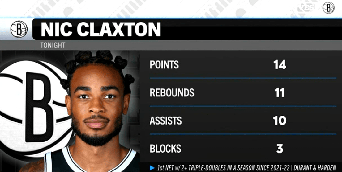 全场比赛,篮网球员尼古拉斯-克拉克斯顿首发出战29分钟,9投5中,罚球6罚4中得到14分11篮板10助攻3封盖。