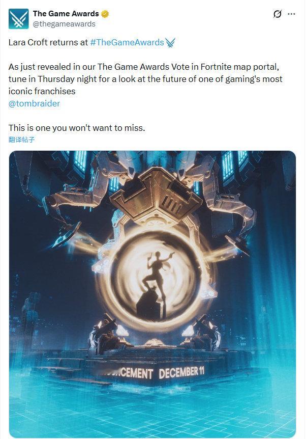 TGA官方宣布将在今年的颁奖典礼上公开《古墓丽影》系列游戏的新消息。本次TGA颁奖典礼将于12月12日上午8点半开始。TGA2025