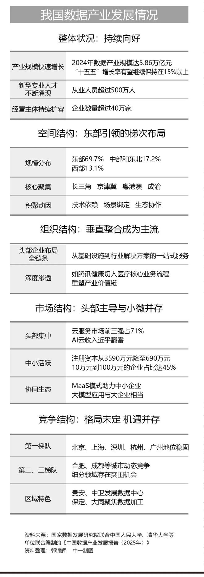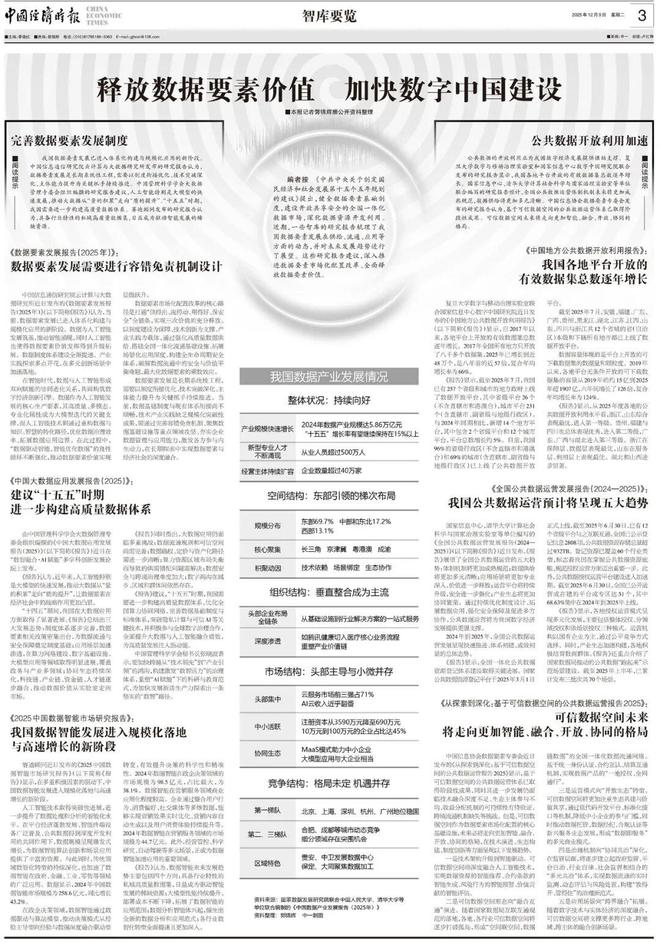 我国数据要素发展已进入体系化构建与规模化应用的新阶段。中国信息通信研究院云计算与大数据研究所发布的研究报告认为,数据要素发展是长期系统性工程,需要以制度衔接优化、技术突破深化、主体能力提升为关键抓手持续推进。中国管理科学学会大数据管理专委会组织编撰的研究报告建议,人工智能特别是大模型的快速发展,推动大数据从“量的积累”走向“质的提升”。“十五五”时期,我国需要进一步构建高质量数据体系。赛迪顾问发布的研究报告认为,具备行业特性的私域高质量数据集,日益成为驱动智能发展的稀缺资源。