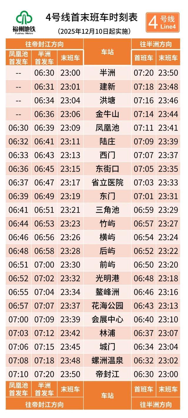 后通段开通后的4号线首末班车时刻表详见下图: