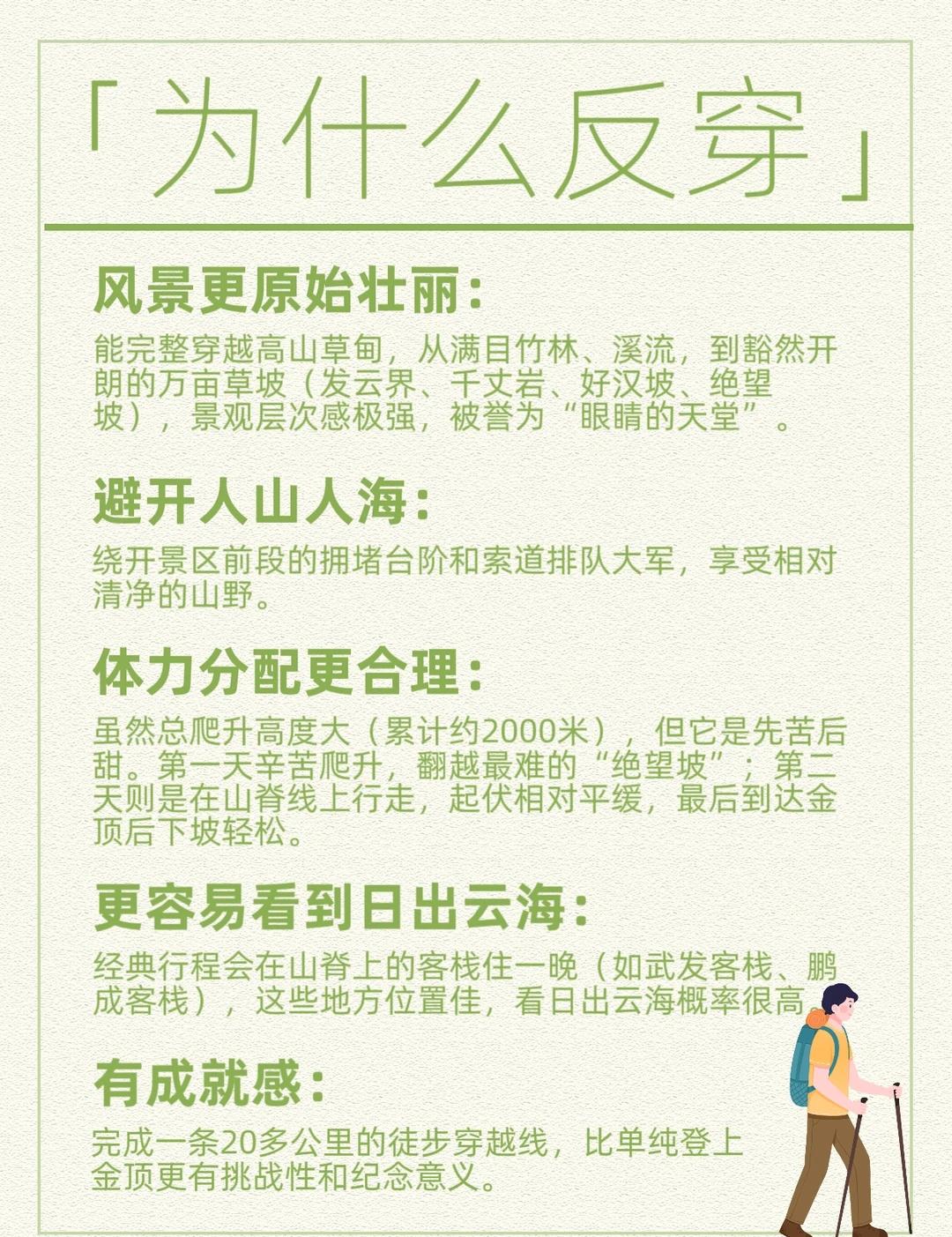 🌾 武功山冬季反穿,流动的金色海洋 刚从武功山回来 遇见了比想象中更辽阔的风景 原来冬天的反穿 是闯入一片被阳光煮沸的、无边的金色草甸 👣【反穿时间线】 1: 龙山村-发云界(7公里,爬升1000) 2: 发云界-好汉坡-吊马庄-金顶-景区大门(16 公里,爬升1200) 📍 【真实体验·闯入金色与白的画卷】 ✅ 龙山村-发云界段:前半程竹林覆着薄霜,后半程豁然开朗——你会亲眼见证什么叫「闯入金色草甸」。夏季的绿浪褪成无边无际的鎏金,风一吹,枯黄的草浪在阳光下闪着毛茸茸的光。搭配远山雾凇,像走进中世纪油画。 ✅ 发云界-好汉坡:这就是传说中的 “金色长廊” 。山脊线清晰可见,小路在蓬松的枯草中蜿蜒。视野极其通透,可以看到很远处的山脉轮廓,层次分明。 ⚠️ 绝望坡:风大到怀疑人生。在毫无遮挡的山脊上,人被吹得摇晃,必须压低重心。回头看,走过的路像一条金色的绸带,飘在山间。 🍜 【山上吃什么】 面包、牛肉干不会冻硬,可以多带。保温杯装热水依然必要,风大水分流失快。 补给:中途摊位可能营业更多。 🎒 【装备清单】 • 穿戴:防风外套最重要! 内层速干+抓绒+轻薄羽绒,方便随体温增减。裤子选防风软壳裤即可。 • 鞋履:高帮防滑登山鞋。 • 配件:保暖帽、魔术头巾(护脸防风)、手套依旧必备。墨镜(防大风和强光)。 • 技术装备:双登山杖(节省体力)、头灯(备用)、充电宝。 • 其他:润唇膏、护手霜(干燥大风下皮肤易裂)、少量现金。 📌 【血泪建议】 1. 防风重于一切:山脊大风是最大挑战,务必扎紧所有衣领袖口。 2. 防火意识:金色草甸极其干燥,绝对禁止任何明火,烟头请彻底熄灭并带走。 3. 珍惜水源:客栈水源依旧珍贵,请节约用水。 📝 参数参考 徒步距离:约23公里(两天) 累计爬升:约2200米 适合人群:有基础徒步经验者 ❄️预期元旦会下雪,期待一下白武吧~ ✨日落与星空:无云天气多,日落时分整个金色世界染上橙红,之后星空秒现,不要错过。 @户外薯 一句向云端我来了武功 武功山 武功山徒步 小小武功山拿捏 户外登山徒步 冬季户外徒步 户外歹物通缉令 歹物分享 2025年度不爱用