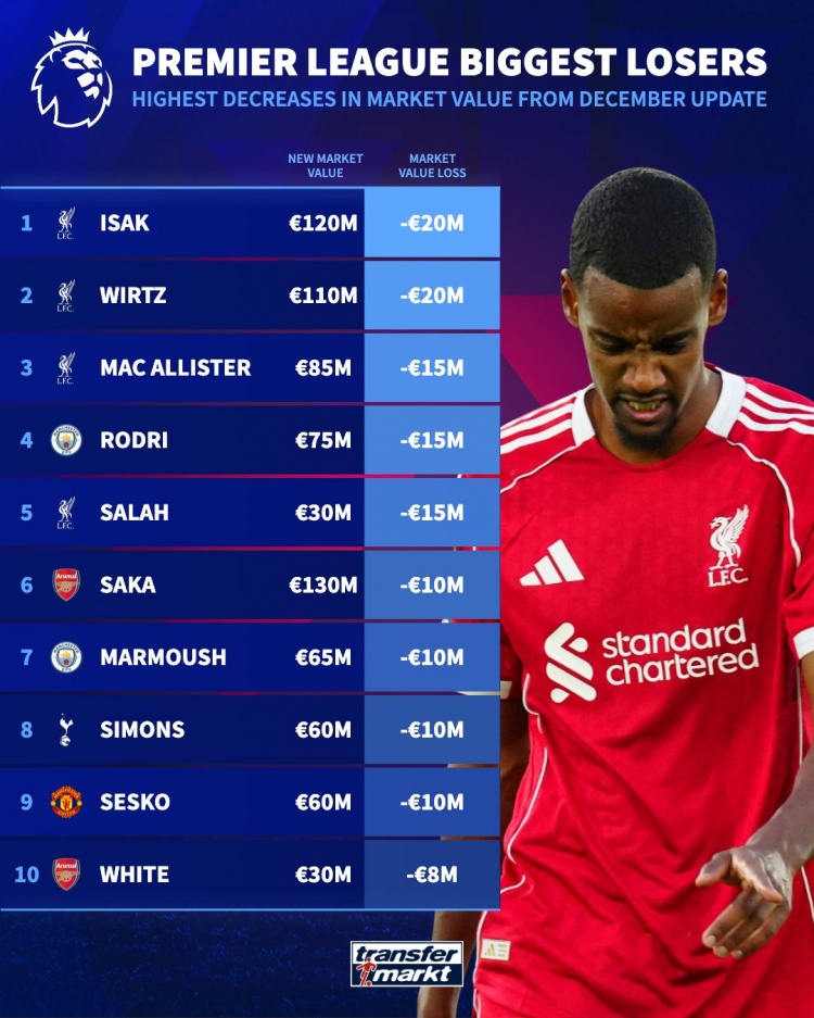 直播吧12月9日讯德转更新英超球员身价,伊萨克、维尔茨均-2000万欧,为本次更新身价下降最多的英超球员。