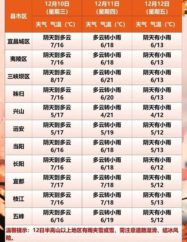 根据最新气象资料分析,受强冷空气影响,预计11日夜间至13日,宜昌将有寒潮大风及雨雪天气,日平均气温将下降5-8℃,局部可下降10℃以上,14日早晨最低气温将下降至1℃左右,高海拔地区最低气温将下降至-5℃以下,12日西部高海拔地区有中雪,积雪深度3-5厘米。