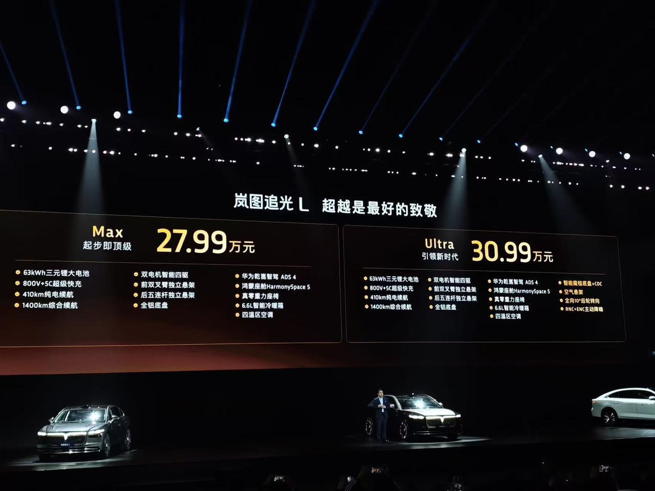 继泰山之后,岚图压轴的旗舰轿车追光L来了 跟早前岚图FREE+策略一致,舒适性装备满配上 追光L入门就带有华为鸿蒙座舱+乾崑ADS4 冰箱、后排扶手屏幕、座椅通风按摩都在 更强大的是63度电池,800V+5C超充 甚至是四驱系统都是标配 旗舰要有旗舰的态度 这次一共两个配置,高低配差距是 空气悬挂、魔毯CDC、后轮转向和降噪 27.99万起步,顶配差距3万 你会怎么选?【来自懂车帝车友圈】