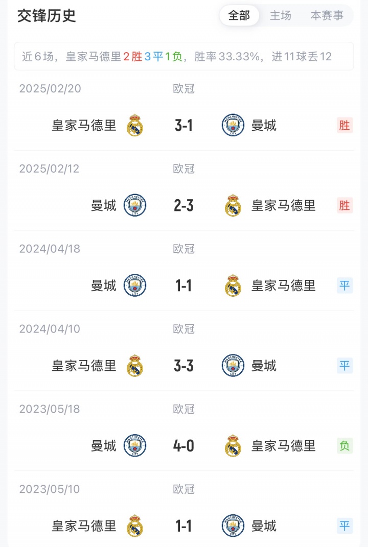 皇马暂以12分排名欧冠第六,曼城10分暂排第十二。上赛季欧冠淘汰附加赛,皇马双杀淘汰了曼城。
