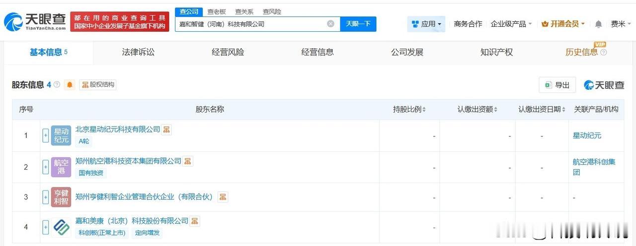 【嘉和美康等在河南成立科技公司 注册资本1亿】 天眼查App显示,近日,嘉和智健(河南)科技有限公司成立,法定代表人为边卫斌,注册资本1亿人民币,经营范围包括智能机器人的研发、人工智能基础软件开发、人工智能理论与算法软件开发等,由北京星动纪元科技有限公司、郑州航空港科技资本集团有限公司、郑州亨健利智企业管理合伙企业(有限合伙)、嘉和美康(688246)共同持股。 天眼查信息: