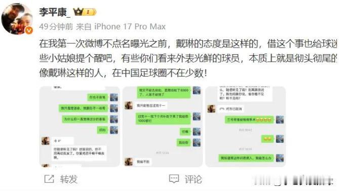 国脚人设彻底崩塌!戴琳欠重病球迷 7 万两年不还,聊天记录脏话连篇,媒体人曝足球圈乱象 中国足坛再爆丑陋丑闻!前泰山队国脚、前国脚戴琳深陷债务纠纷,欠山东球迷 7 万元欠款长达两年拒不归还,而债主身患重病正急需这笔钱救命。更令人发指的是,球迷多次恳求讨债时,戴琳不仅毫无愧疚,反而在聊天记录中脏话连篇、破口大骂,粗俗言行颠覆公众对职业球员的认知,网友怒批:“球品差人品更差!” 这场纠纷早已不是首次曝光!球迷晒出的聊天记录清晰显示,他多次卑微恳求戴琳 “救命钱能不能先还”,言语间满是无奈与急切,而戴琳要么置若罔闻,要么态度傲慢,甚至用下流语言辱骂债主,完全一副 “欠钱是大爷” 的无赖姿态。在媒体人李平康首次不点名曝光后,戴琳依旧毫无收敛,“死猪不怕开水烫” 的架势让球迷彻底寒心。 李平康的爆料更戳破行业遮羞布!他直言 “借此事提醒球迷和小姑娘,外表光鲜的球员可能是彻头彻尾的无赖,戴琳这样的人在中国足球圈并非个例”。这番话揭开了足坛不良现象:部分球员成名后迷失自我,忘记公众人物的社会责任,把职业成就当作耍无赖的资本,诚信与品德抛诸脑后。 作为曾驰骋绿茵场的国脚,戴琳曾是球迷心中的悍将,如今却因欠债不还、出口伤人形象尽毁。网友刷屏怒斥:“欠债还钱天经地义,何况是救命钱,简直毫无底线”“公众人物这样做影响太恶劣,该封杀”“中国足球不仅技不如人,球员品德更该好好整治”。 此事给中国足球敲响警钟:足球崛起不仅需要技战术提升,更要守住品德底线。德才兼备才能赢得球迷信任,而不是靠名气肆意践踏道德。你觉得该如何整治足坛失德乱象?戴琳是否该公开道歉还钱?评论区聊聊~