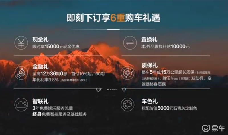 即刻下订即享6重购车礼遇,包含限时享15000元现金优惠;本/外品置换补贴10000元;至高12万36期0息;首付10%起,60期年化利率3.8%(折合年费率约1.99%);整车5年或15万公里超长质保(时间或里程,以先到者为准),首任车主(非营运)发动机、变速器终身质保;3年免费娱乐服务流量,终身免费智控服务及基础服务;标配价值5000元石青灰定制色。