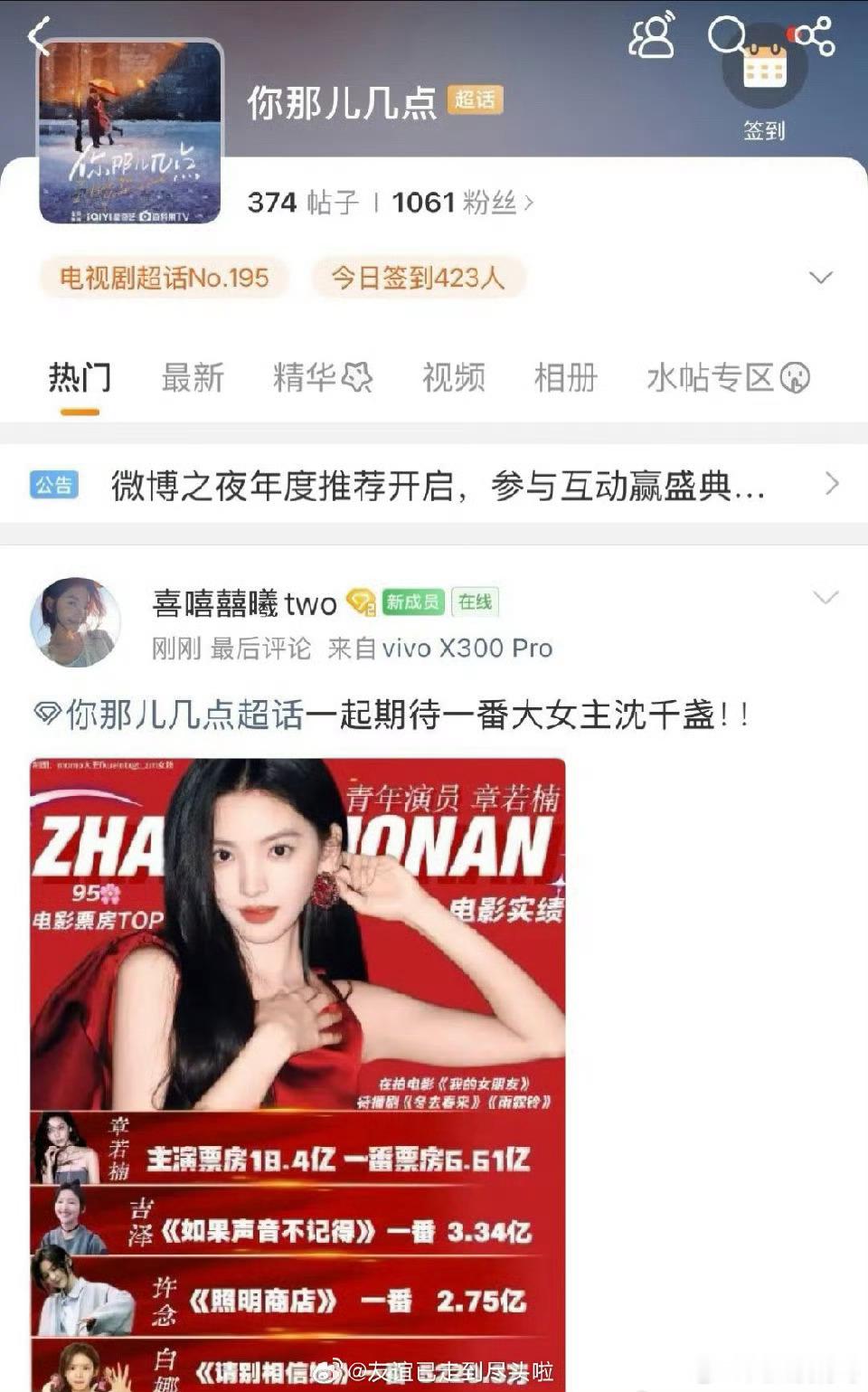 王安宇和章若楠粉丝各为新剧开了一个超话