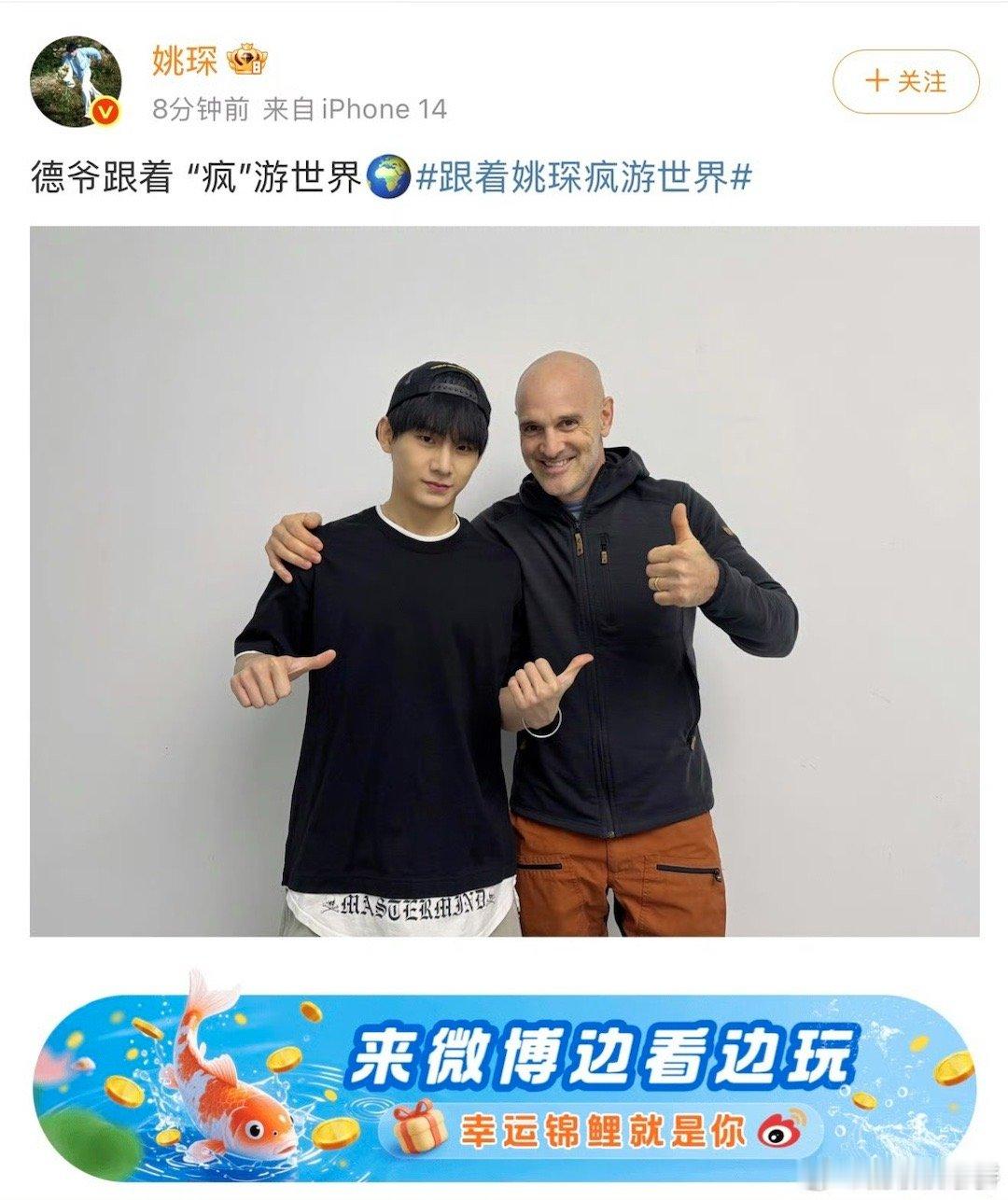 姚琛怎么和德爷玩一块了 姚琛的冒险DNA又动了!这次直接对标地球生存天花板。合照仿佛在预告:接下来,请收看由偶像转型中的冒险家为您带来的《荒野生存实录》。