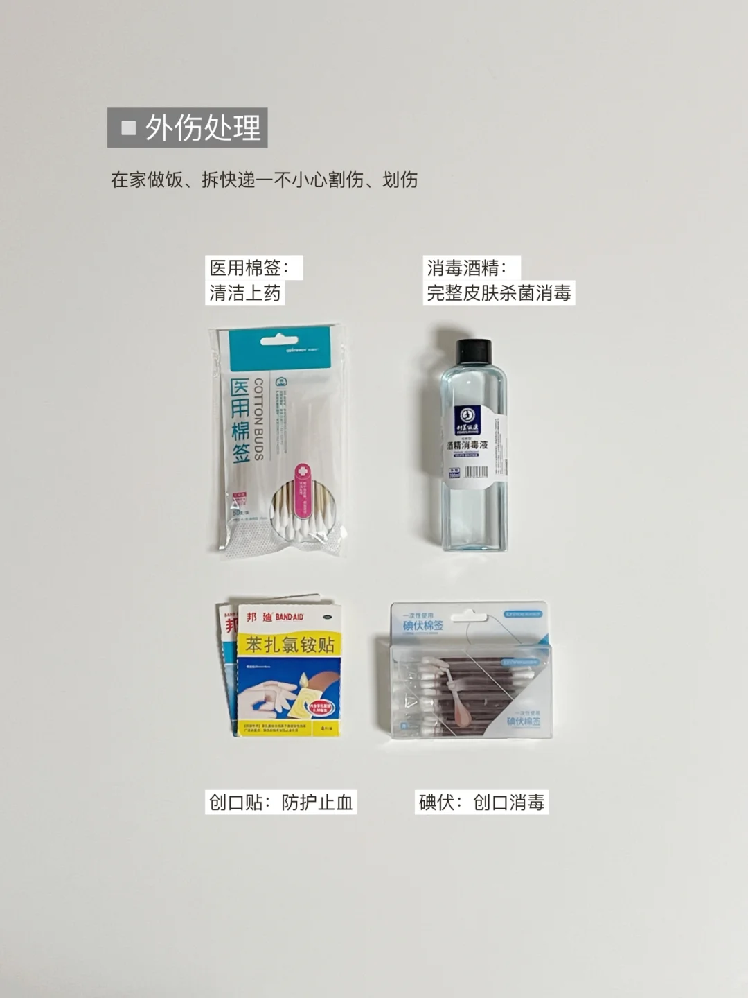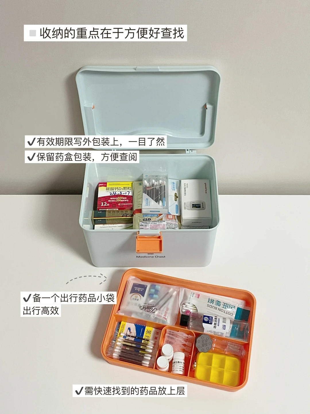 ③根据取用频率合理收纳,需要快速找的创口贴、碘伏、棉签等放在上层