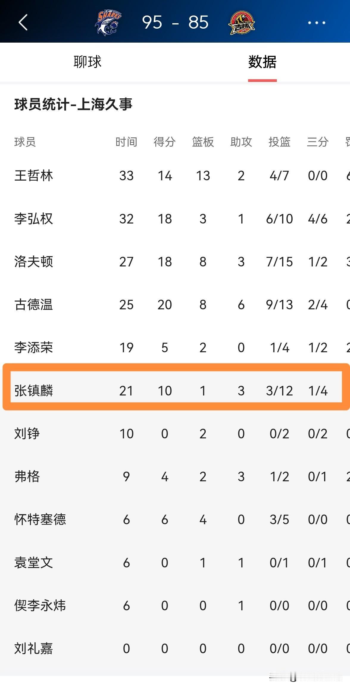 上海久事球星张镇麟真是无药可救了!在今天上海久事主场以95:85击败吉林长白山恩都里的比赛中,张镇麟的表现真是无比的糟糕。 全场比赛下来,张镇麟替补出战21分钟,投篮12中3,其中三分球4中1、罚球4中3非常低效的得到10分。 值得一提的是,本场比赛张镇麟在上半场比赛中怒砍0分。