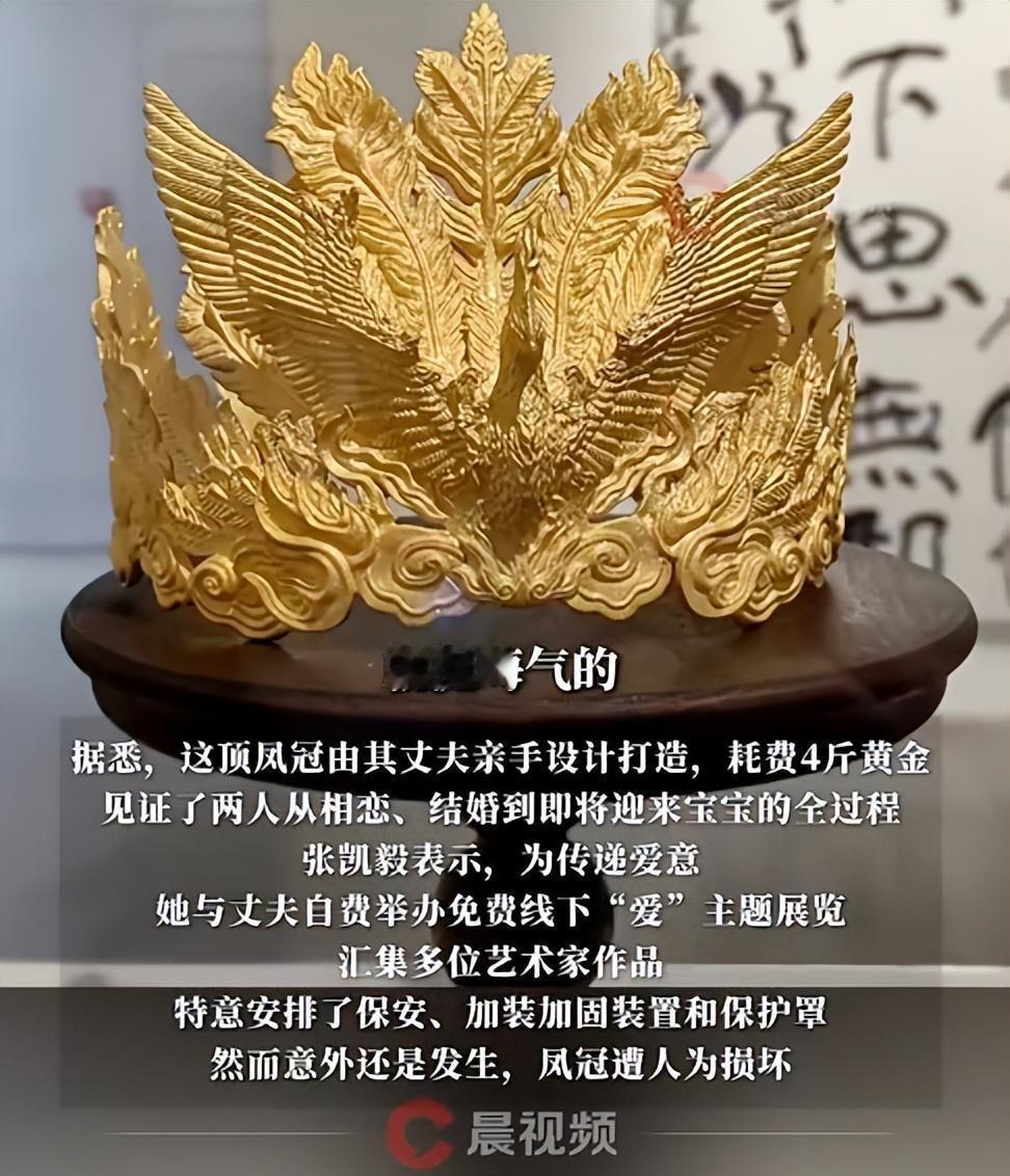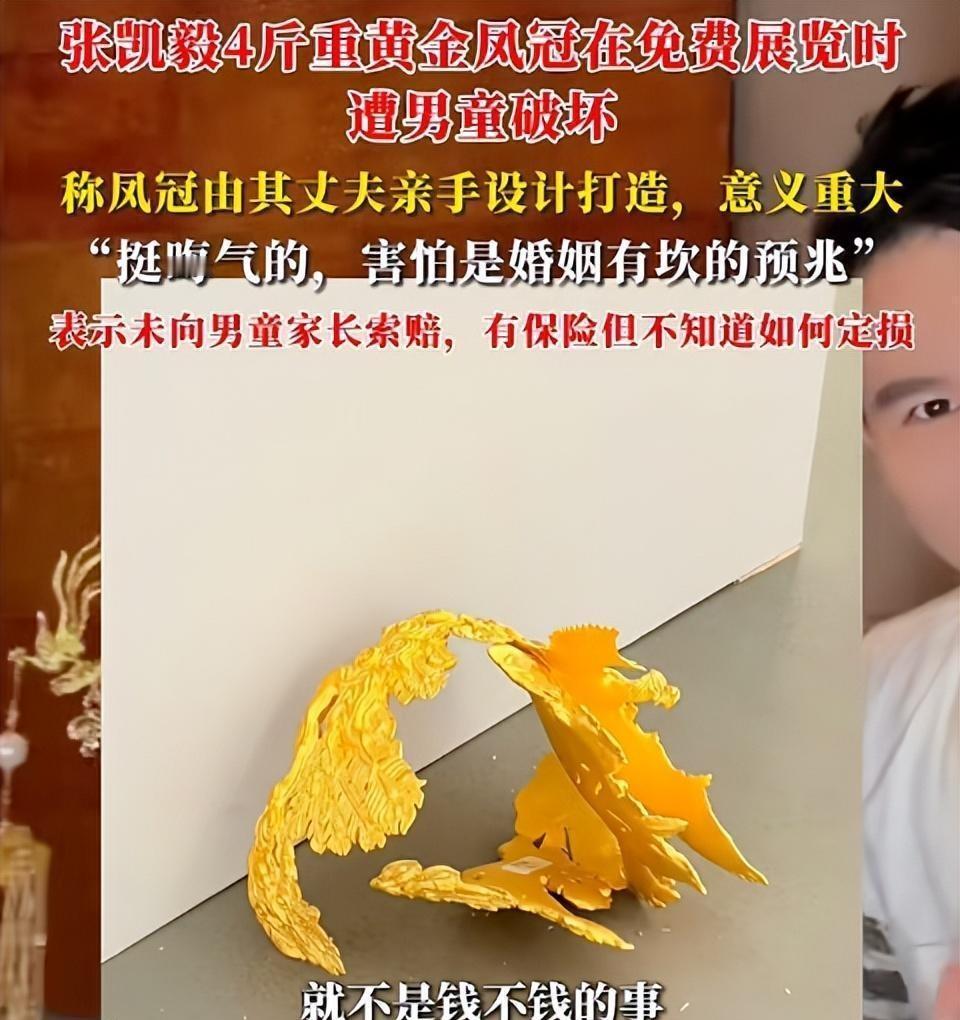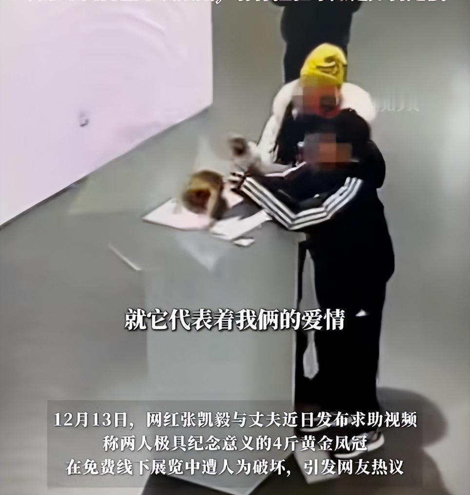 千万粉丝网红自曝 4 斤重黄金凤冠被毁,监控画面曝光,具体情况如何?责任该如何认定? 12月13日,千万粉丝博主张凯毅在社交平台发视频称,丈夫在结婚时为她亲手打造的4斤重黄金凤冠,在自己办的免费展览上被人为破坏了。 视频中,一男孩在观展中,反复抱住展台柜子,并上手触碰,随后至凤冠与展罩一起掉在地上。 张凯毅称“这场展览是自己与丈夫办的免费展览,收集了很多艺术家的作品。没有收任何的门票,也没有牟利。我们也请保安了,也在外面加装了加固和罩子。这个黄金凤冠对我们的意义太重要了,这种情况下被人破坏了,真的很闹心。这个东西是丈夫亲手设计打造的,不是市场上能买到、能定价的东西。希望懂的人能帮忙分析一下,这个事要怎么定损。同时也想呼吁大家,线下看展不要用手触碰。” ------------------------------------ 炫富 碰瓷 引流 小孩哥无责