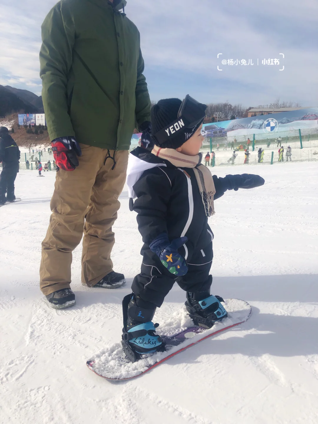 在雪场的选择上,还是条件相对好一点的 南山滑雪场[地点]。对小朋友比较友好,也有儿童雪具可以租。对于2岁左右,90cm左右的小朋友,可以选择最短的板子和最小27号的鞋子,鞋稍微大一点,可以穿个厚点的袜子然后系紧一点。