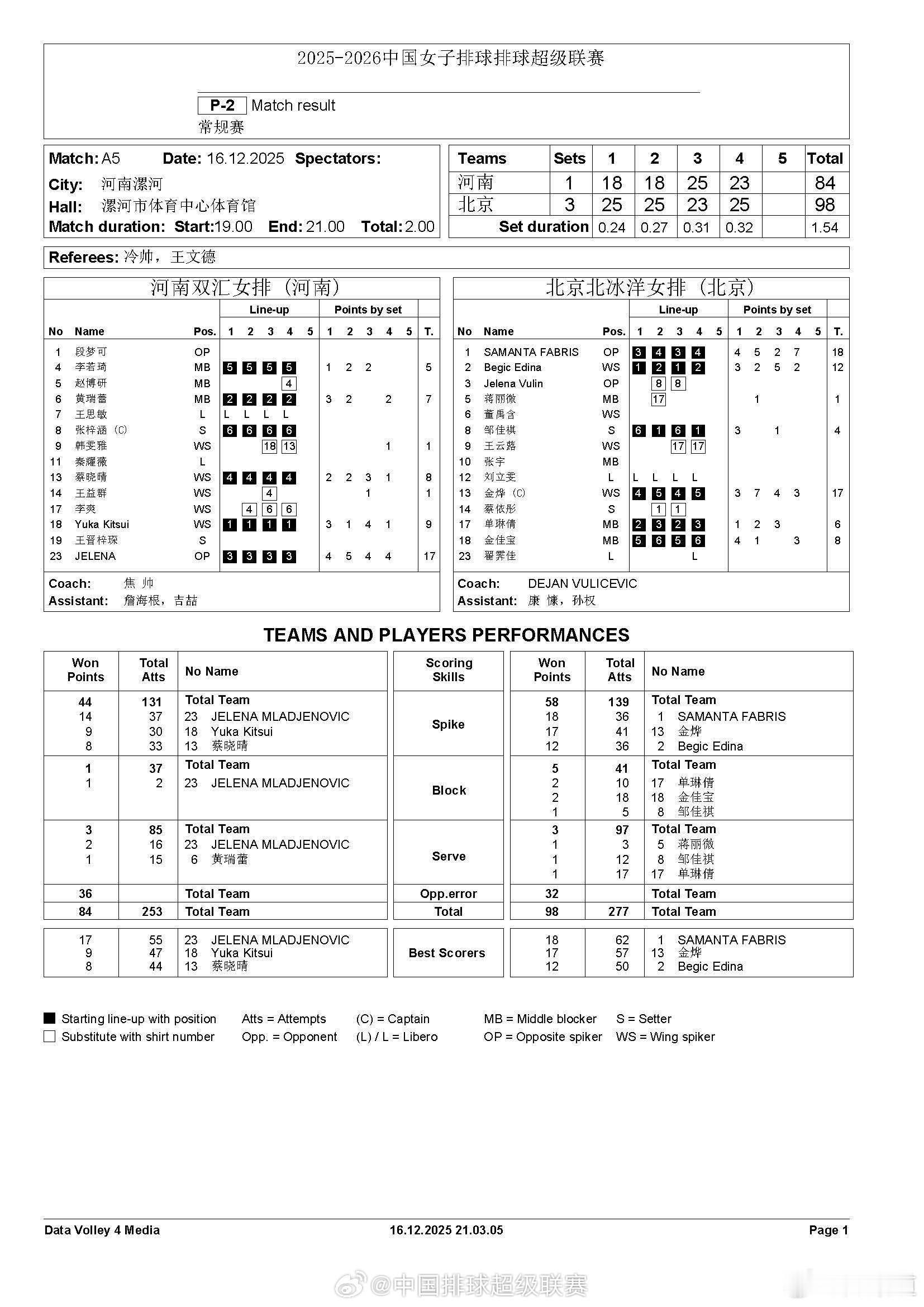 排超联赛2025-2026中国排球超级联赛河南女排1-3(18-25/18-25/25-23/23-25)北京女排技术统计 河南队-北京队 进攻:44-58;拦网:1-5;发球:3-3;自失:32-36姆拉杰诺维奇:17分 37扣14中2失误0被拦 1拦2发橘井友香:9分 30扣9中0失误2被拦蔡晓晴:8分 33扣8中2失误2被拦黄瑞蕾:7分 13扣6中3失误0被拦 1发李若琦:5分 11扣5中0失误2被拦韩雯雅:1分 4扣1中0失误0被拦王益群:1分 1扣1中 法布里斯:18分 36扣18中2失误0被拦金烨:17分 41扣17中2失误0被拦贝吉奇:12分 36扣12中2失误0被拦金佳宝:8分 12扣6中0失误0被拦 2拦单琳倩:6分 9扣3中0失误1被拦 2拦1发邹佳琪:4分 3扣2中0失误0被拦 1拦1发蒋丽微:1分 1发