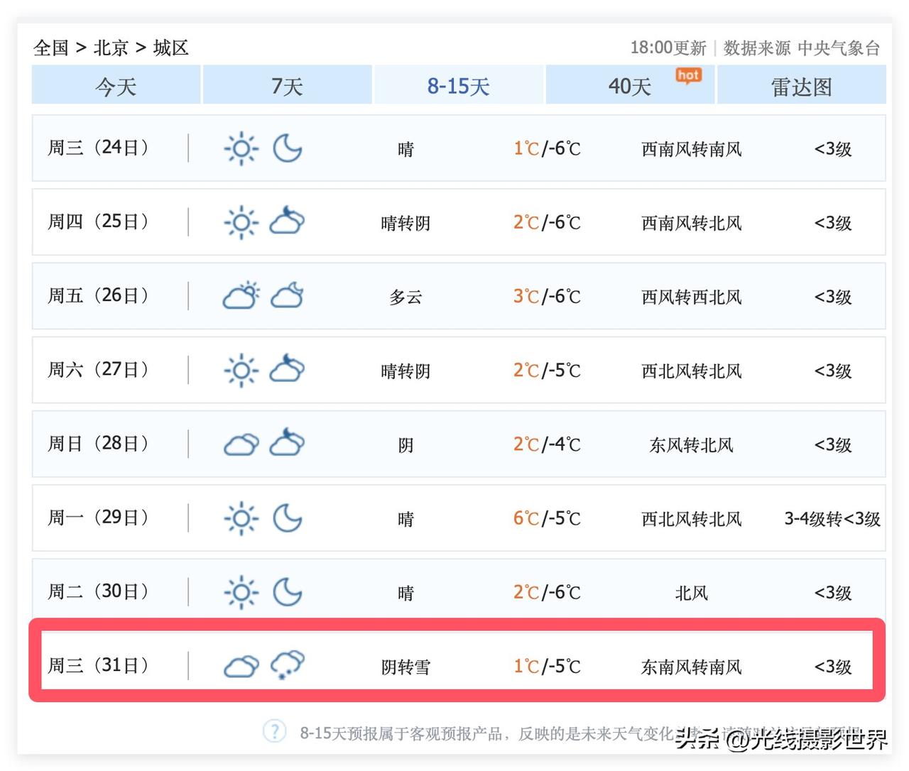 北京天气预报,永远充满惊喜啊!12月18日到30日,北京多云晴好为主,但是,12月31日,跨年夜的晚上,北京有可能下雪……啊啊啊!我每天都在看超级计算机给出的北京中长期天气预报,我好想去北京故宫看雪拍照啊!我好想去颐和园,天坛,景山公园……雪景啊!北京的雪景,对于摄影爱好者,摄影发烧友,手机摄影达人……太有吸引力啦! 北京天气预报,令人心动啊! 这个月,今年,北京真的还要下雪吗?!