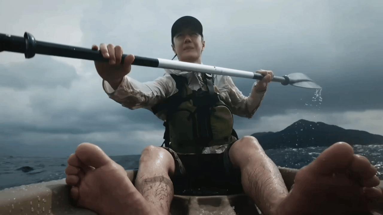 探索新境2,王一博划皮艇,腿上伤疤密密麻麻。还记得第一季是没有这么多伤口的!每一道伤口都是王岩羊的勋章🎖️🎖️🎖️
