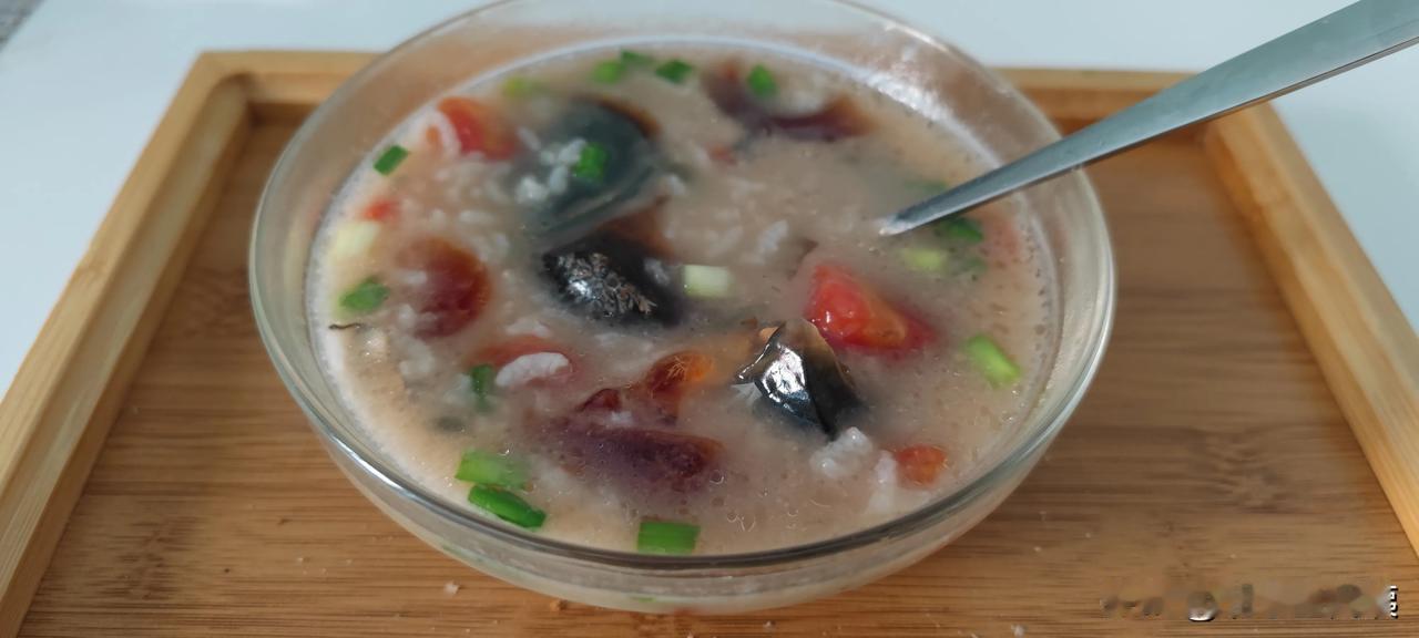 。 今天午餐是一顿五彩漂亮饭。我用泡发生蚝干10克切碎,葱姜爆香,加开水450克, 加入洗净大米30克熬粥, 十分钟后加入两个切碎的皮蛋,出锅前用生抽,蚝油调味放入两勺西红柿丁,再来一小勺香油,撒上葱花。我和老伴儿每人一碗五彩漂亮粥。 用电烤箱烤了两个荠菜馅玉米团子。 这一顿饭红黄绿黑白五色俱全了,可以称得上是一顿漂亮饭吧?