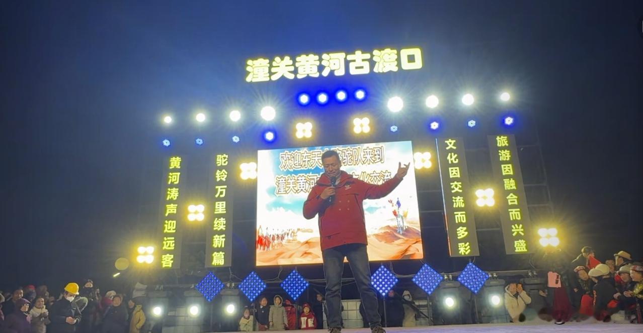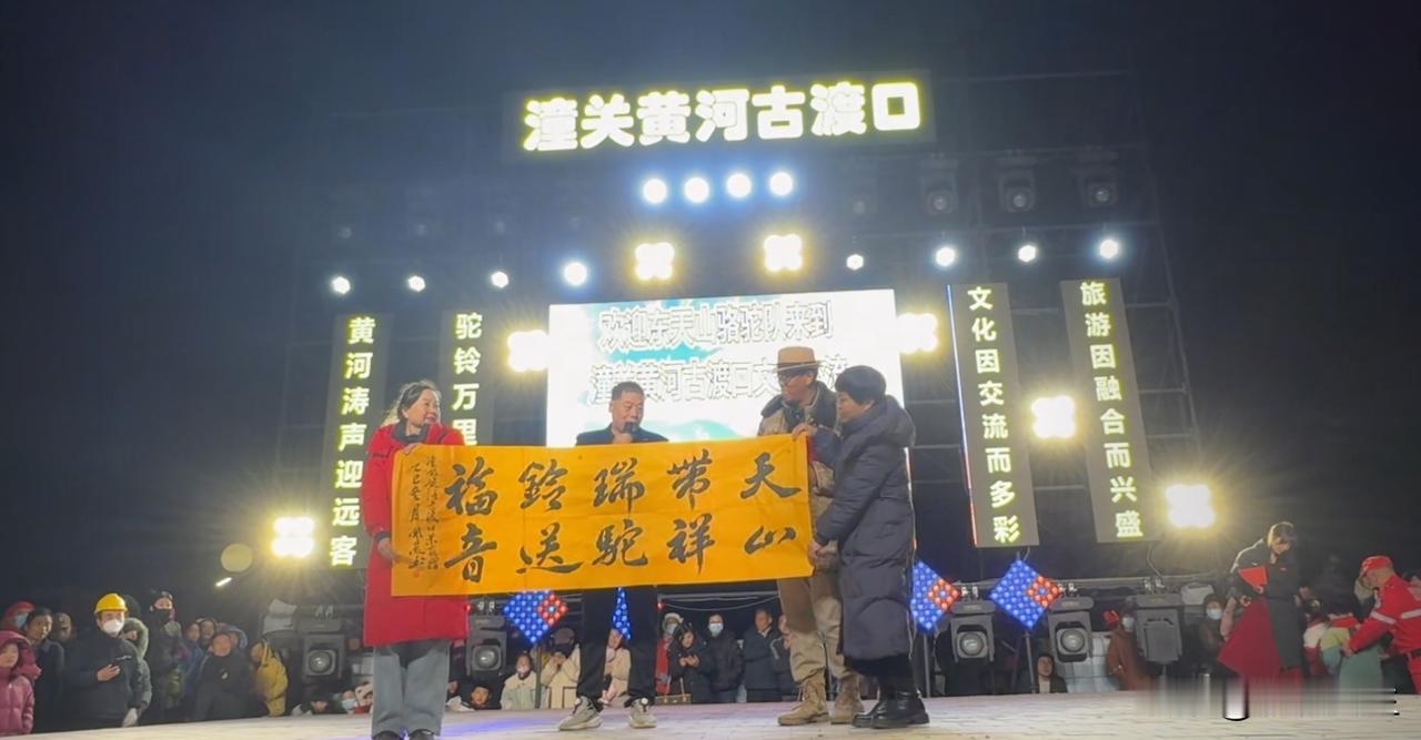 东天山骆驼队在陕西潼关黄河古渡口景区受到高规格接待,仿古仪仗队,现代锣鼓队,列装洋鼓洋号队景区外一公里处迎接后一路欢歌笑语,锣鼓齐鸣,应急车开道,古装彩旗手两列夹道而行,路旁万名群众兴高采烈隆重欢迎。 晚上篝火晚会更是精彩纷呈,表演地方特色节目,邻居兄弟省份河南省相关景区也带来精彩演艺,东天山骆驼队更是一段新疆地方特色舞蹈将晚会带向高潮,现场掌上雷鸣,欢歌笑语。 晚会还向东天山骆驼队赠送了墨宝,食品,地方特色美食等等
