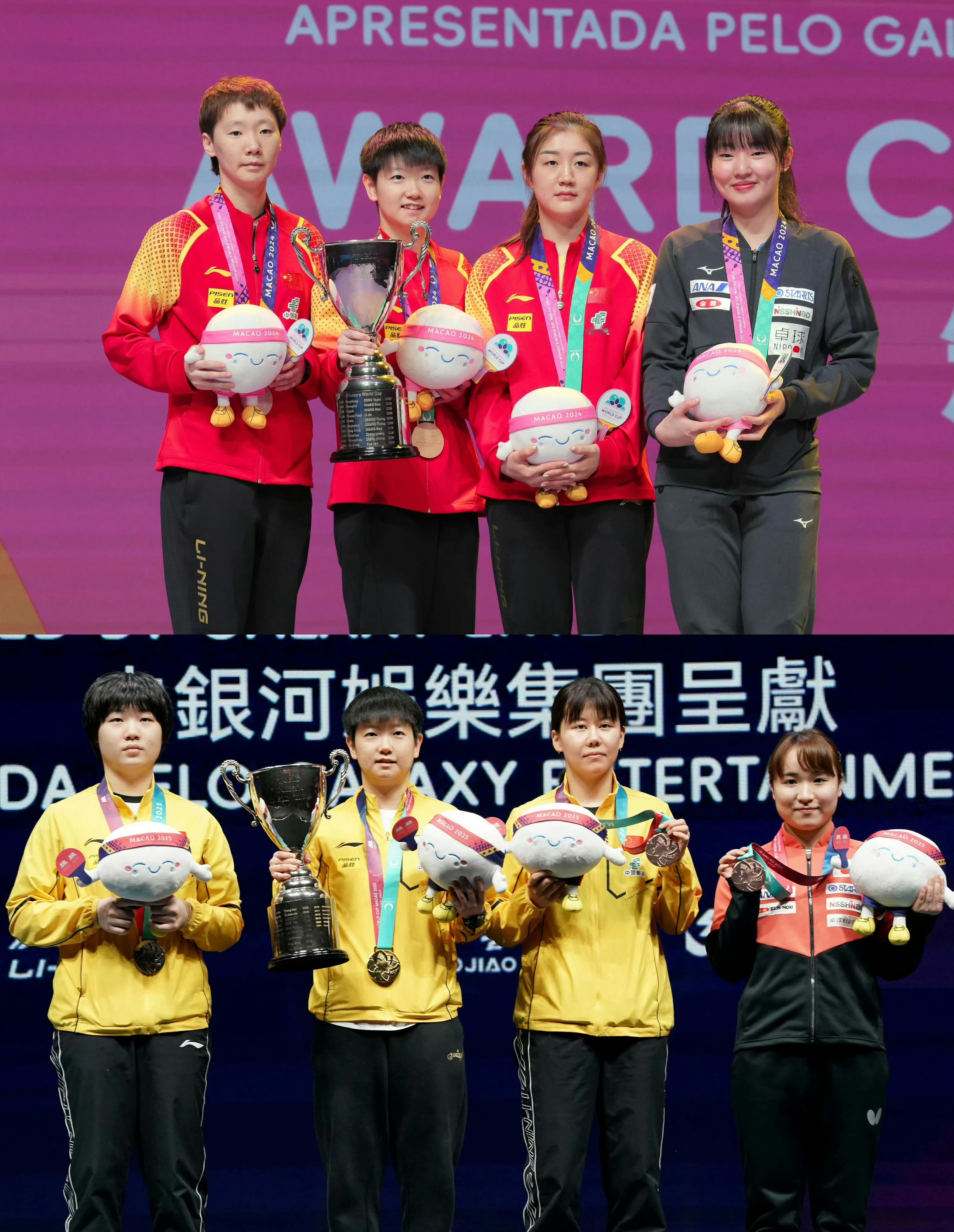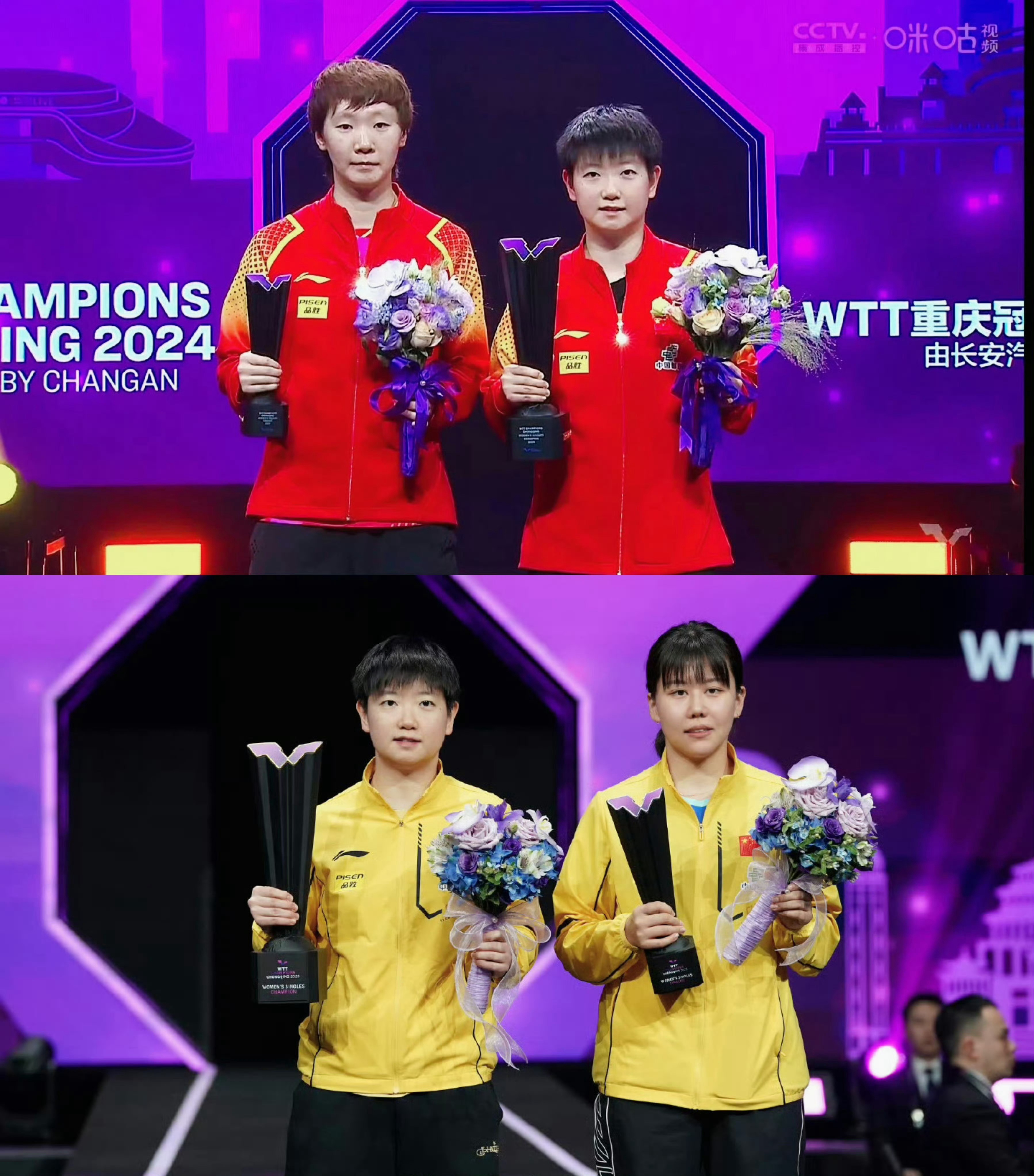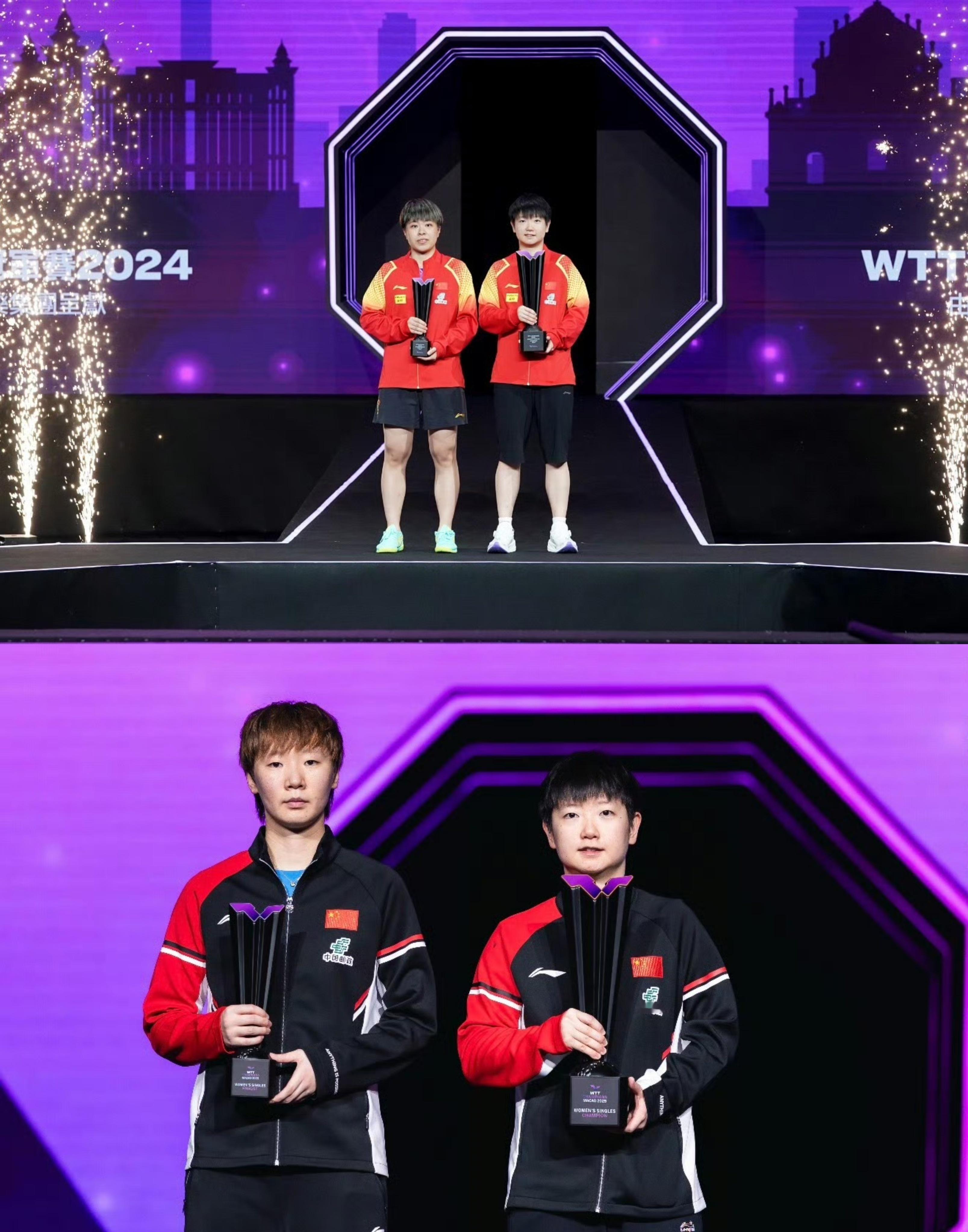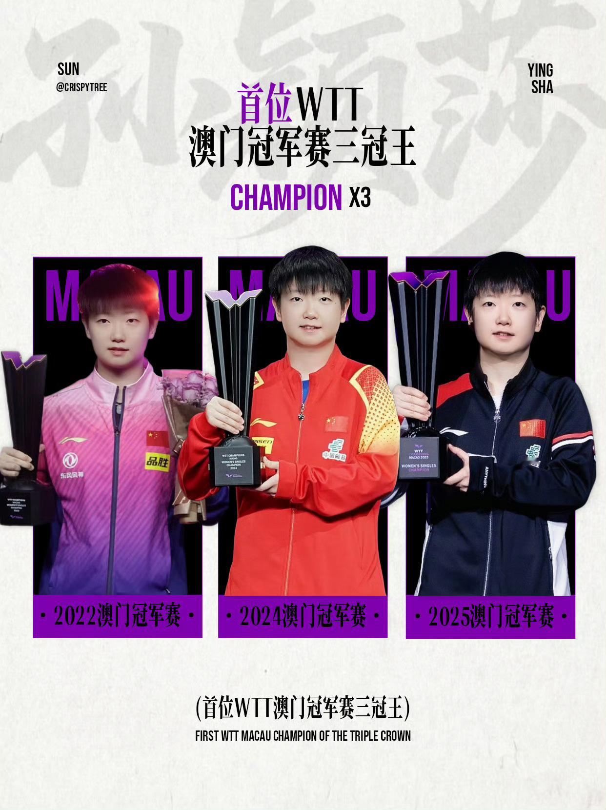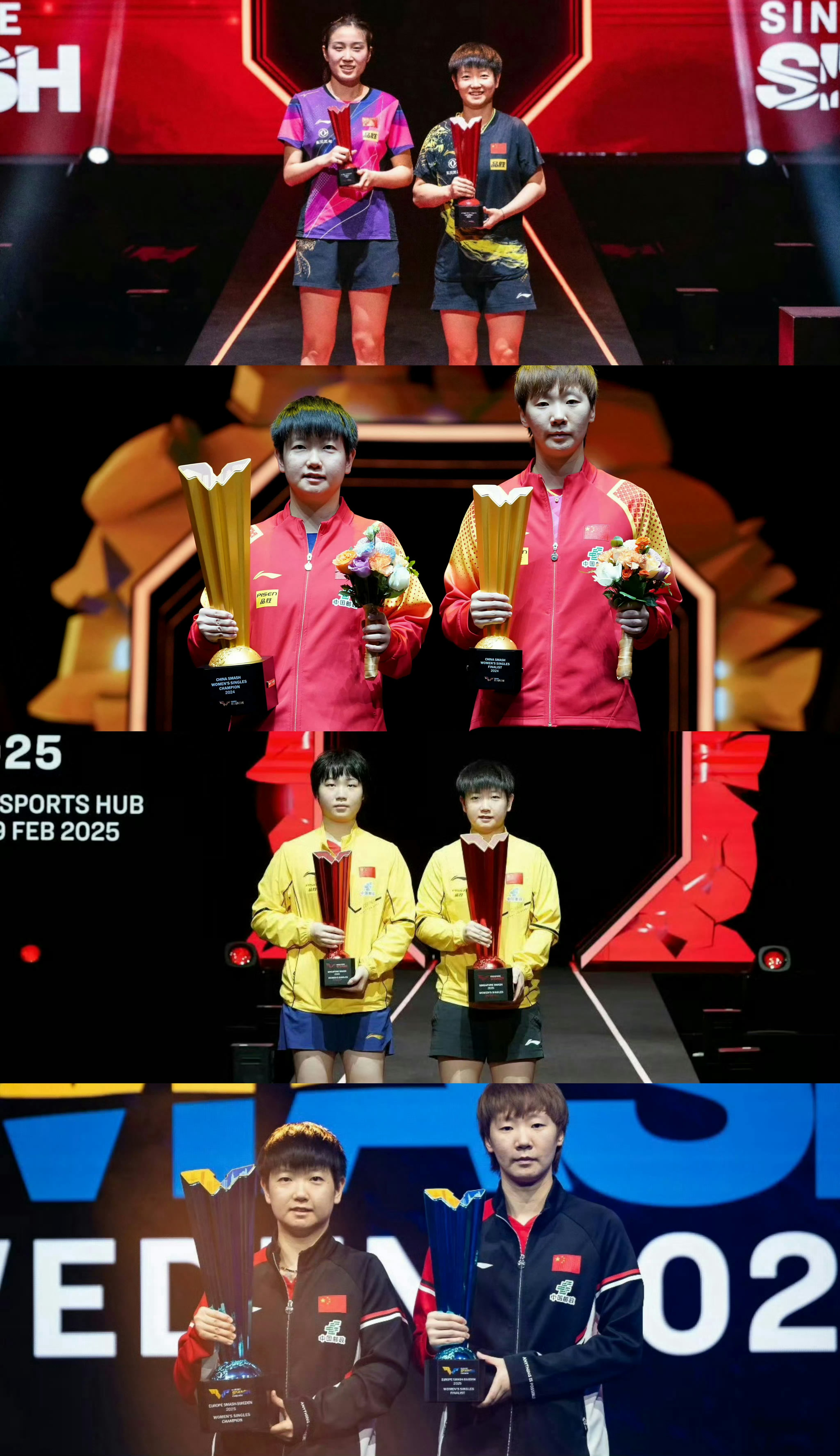 孙颖莎 🏓2025赛季孙颖莎收获国际赛事单打冠军【6️⃣冠】🏆🏆🏆🏆🏆🏆其中4️⃣座国际赛事女单冠军成功卫冕——【三月成功卫冕重庆冠军赛女单🏆】【四月成功卫冕世界杯女单🏆】【五月成功卫冕世乒赛女单🏆】【九月成功卫冕澳门冠军赛女单🏆】包揽【2025唯二】三大赛单打世冠【世界杯世乒赛双卫冕】,达成【女乒历史首位且唯一世乒赛双圈金满贯】,首位WTT大满贯赛事单打四冠王,首位WTT澳门冠军赛单打三冠王。2025六座国际赛女单冠军决赛赛果——1️⃣WTT新加坡大满贯女单冠军🏆2000决赛 【孙颖莎4—1蒯曼】2️⃣WTT重庆冠军赛女单冠军🏆1000决赛 【孙颖莎4—0陈幸同】3️⃣ITTF澳门世界杯女单冠军🏆1500决赛 【孙颖莎4—0蒯曼】4️⃣ITTF多哈世乒赛女单冠军🏆2000决赛 【孙颖莎4—3王曼昱】5️⃣WTT瑞典大满贯女单冠军🏆2000决赛 【孙颖莎4—2王曼昱】6️⃣WTT澳门冠军赛女单冠军🏆1000决赛 【孙颖莎4—3王曼昱】