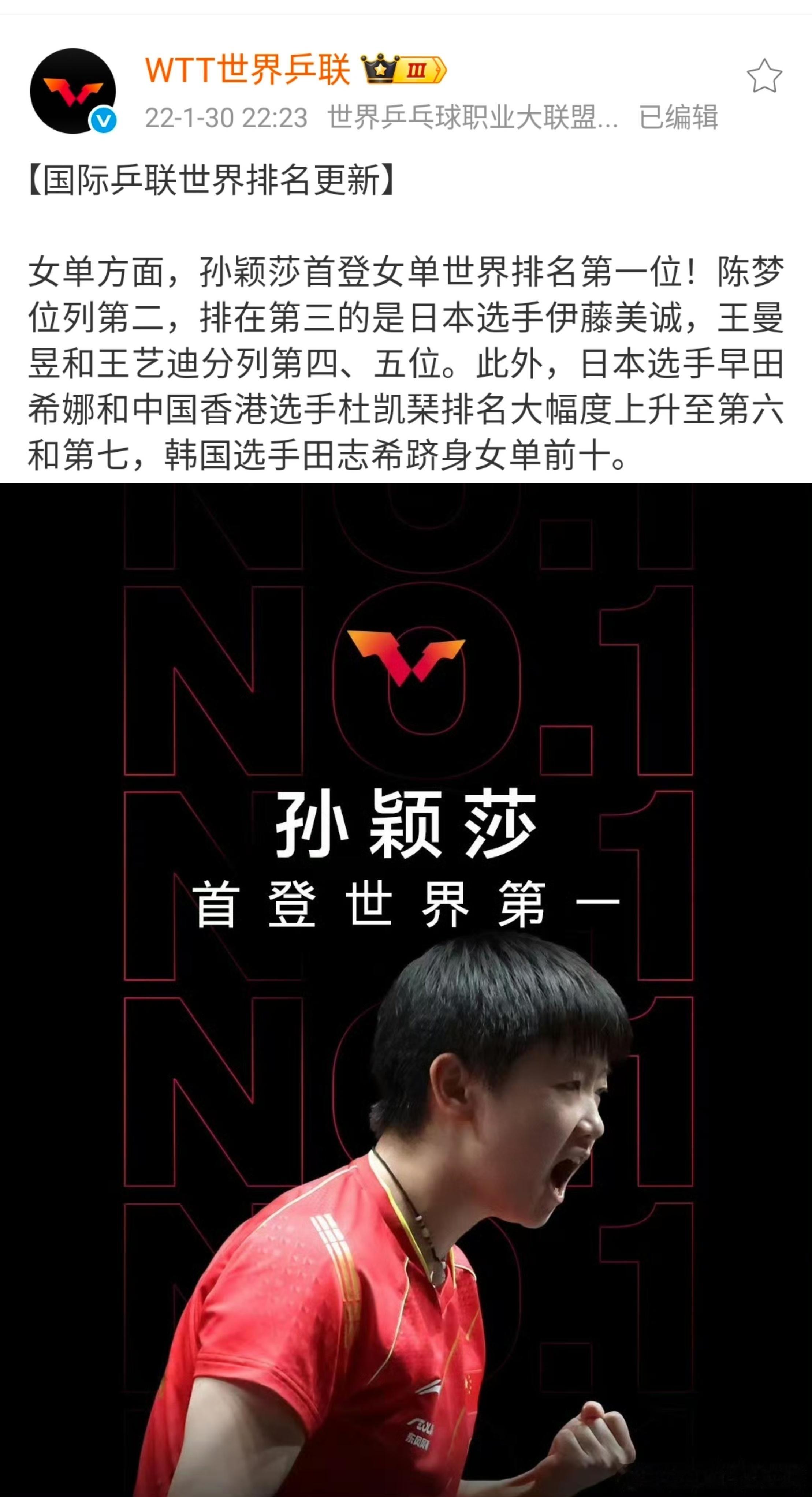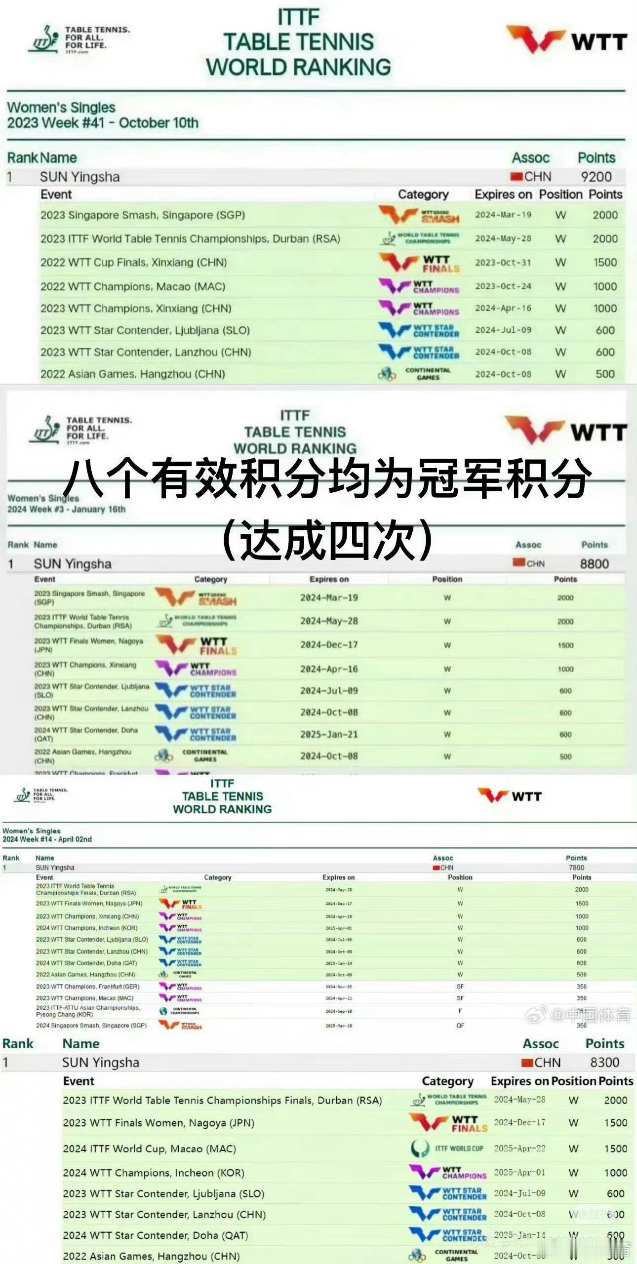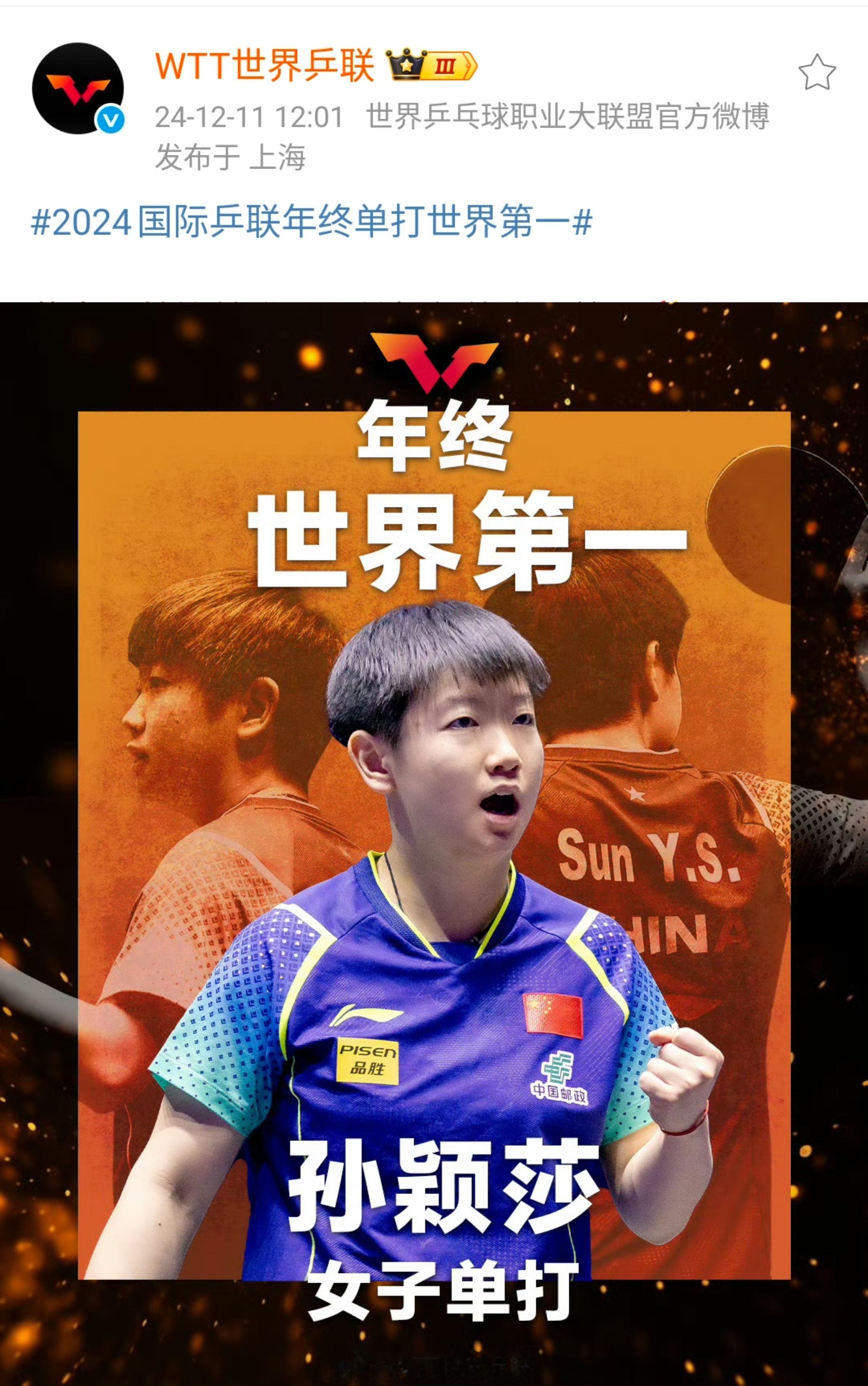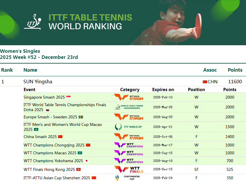 孙颖莎连续四年女单年终世界第一⭐16岁首次出道国际赛白金双冠,仅用21天狂揽2999分从无积分空降世排前十⭐19岁起连续六年保持女单世排前三⭐21岁首登女单世界第一,乒坛首位00后单打世界第一☝🏻⭐22岁首登年终女单世界第一☝🏻⭐23岁蝉联年终女单世界第一☝🏻⭐24岁连续三年年终女单世界第一☝🏻⭐25岁连续四年年终女单世界第一☝🏻⭐自2022年7月17起连续181周霸榜女单世界第一☝🏻⭐乒坛首位且唯一新积分体系下八个有效积分均为冠军积分的球员(四次达成)⭐世界排名新积分体系下首位世排积分破万的球员且最高积分记录📝保持者 2024年10月【10800】 2025年2月 【11300】 2025年5月 【11900】 2025年8月 【12200】孙颖莎的记录只由孙颖莎自己来打破☝🏻孙颖莎