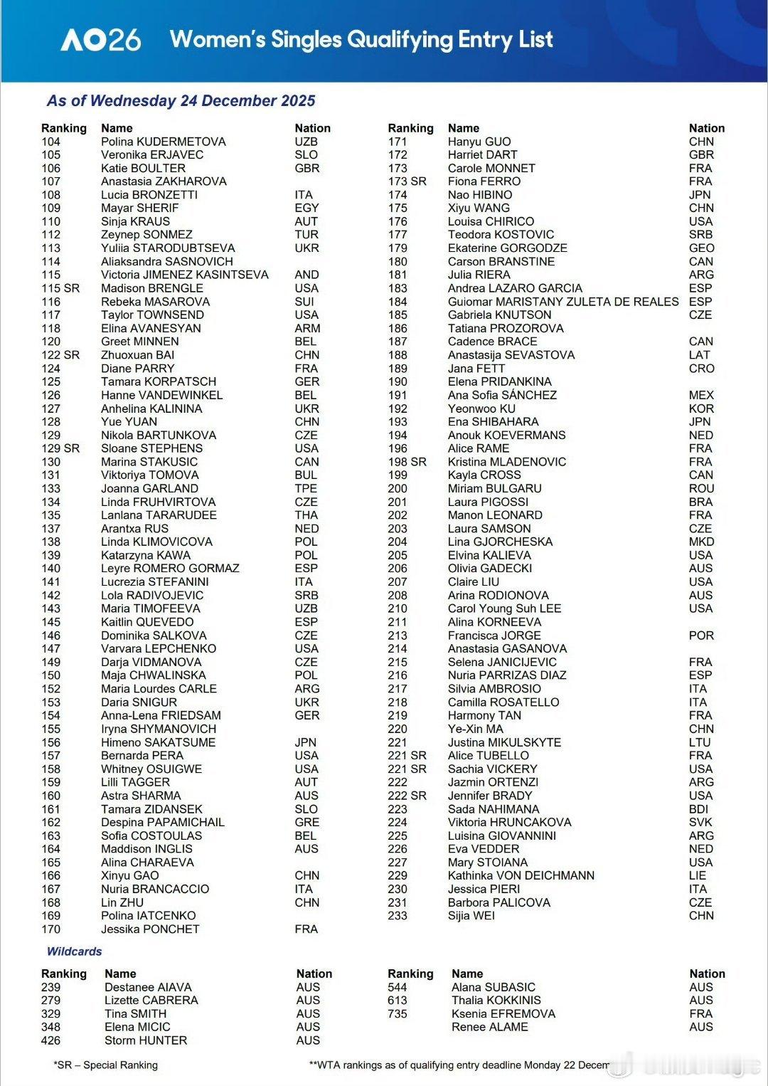 2026年澳大利亚网球公开赛资格赛将于1月12-15日举行,中国大陆选手共9人参赛。【男子】吴易昺【女子】袁悦、朱琳、白卓璇、高馨妤、王曦雨、郭涵煜、马烨欣、韦思佳