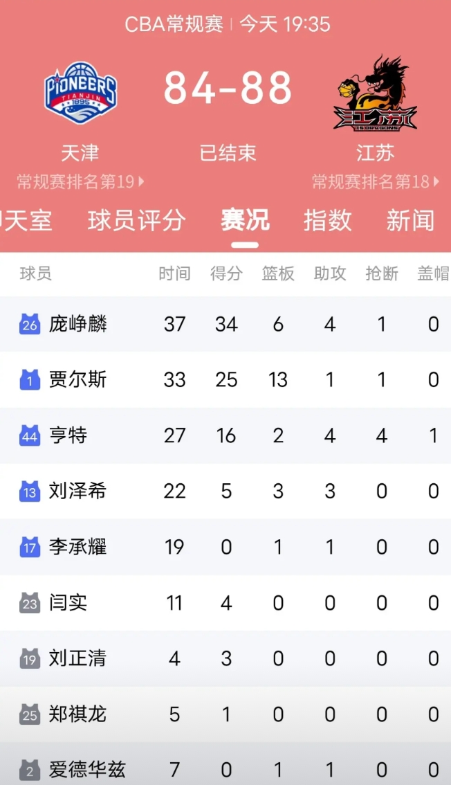 CBA常规赛第五轮,四连败的江苏队客场挑战四连败的天津队,江苏队凭借庞峥麟全场狂砍34分以88:84击败天津取得新赛季首胜。