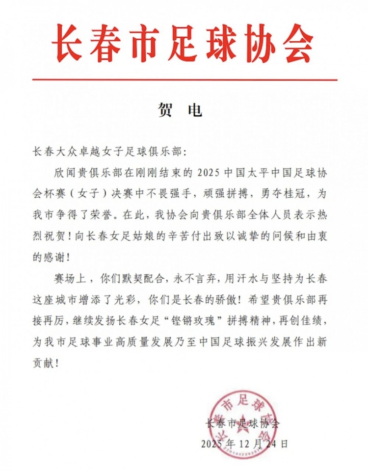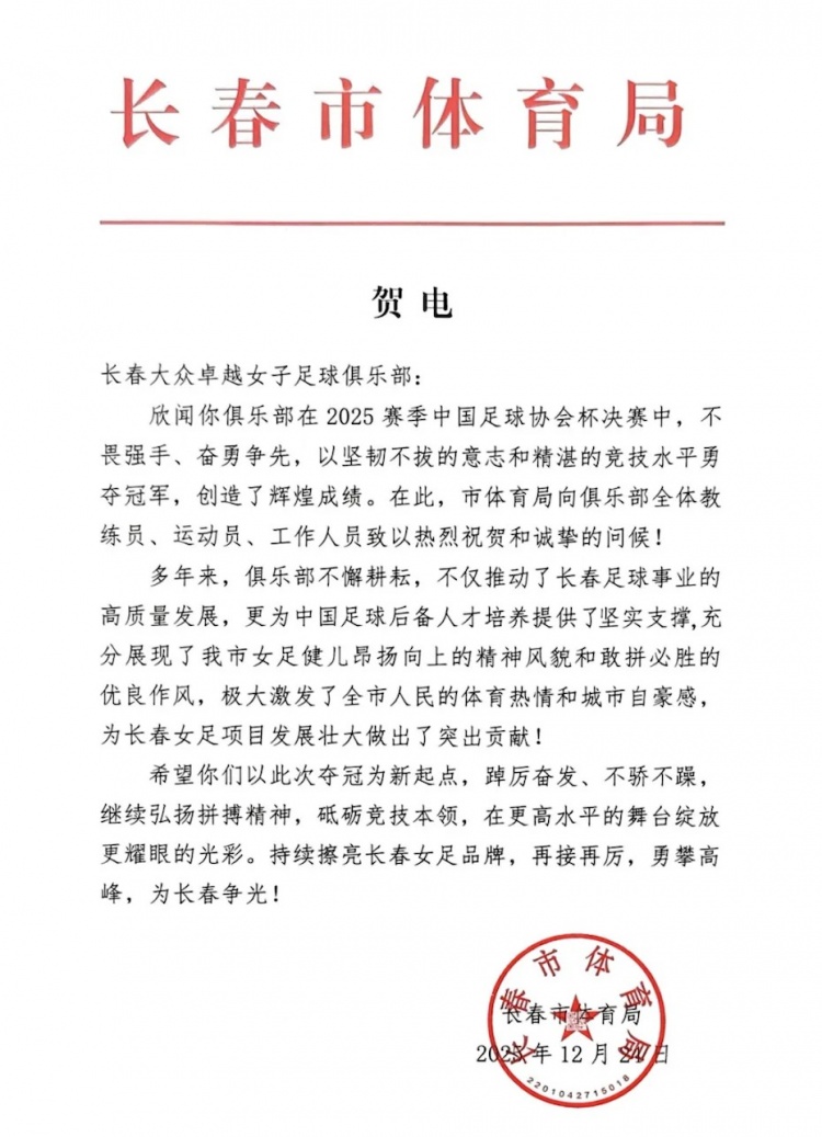 直播吧12月24日讯长春大众卓越女足获得2025年女子足协杯冠军,长春市体育局、长春市足球协会送上祝贺。