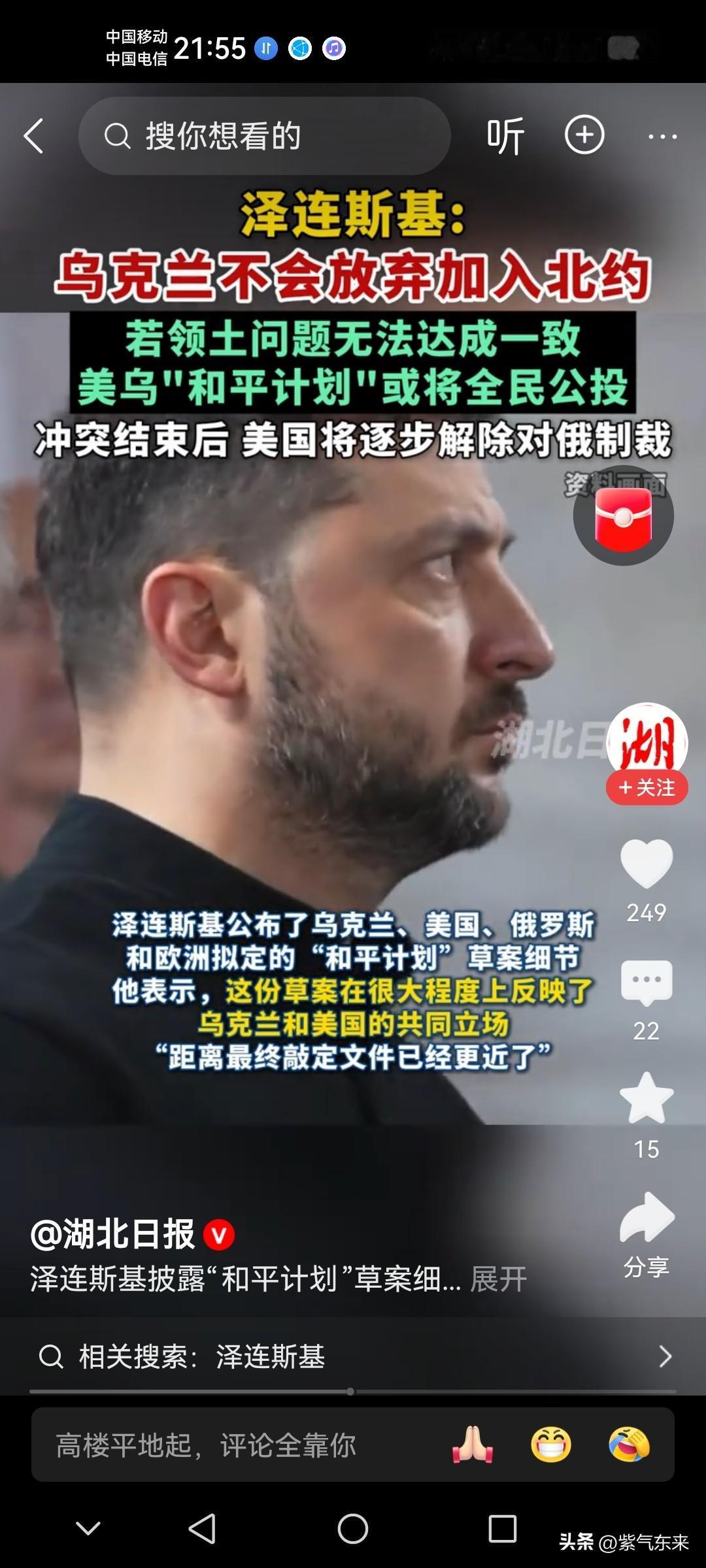泽连斯基终于做出让步了,但是有前提谈不妥就公投! 但是乌克兰不会放弃加入北约,加入北约能给乌克兰足够的安全感! 北约是个军事组织,一旦加入北约,如果北约成员国中任一个成员国遭受攻击,就等同于向北约宣战,北约可以说是一个强大的军事联盟组织,俄罗斯也无法抗衡,这就是乌克兰痴迷加入北约最大的动机! 北约成员国之间集体防御,军事协同! 北约现在有32个成员国,美国加拿大都是北约成员! 乌克兰也不想打了,打也打不赢俄罗斯! 乌克兰也说了,如果领土问题无法达成共识,那美国所谓的“和平计划”或将进行全民公投,交给人民自己去选择!乌克兰