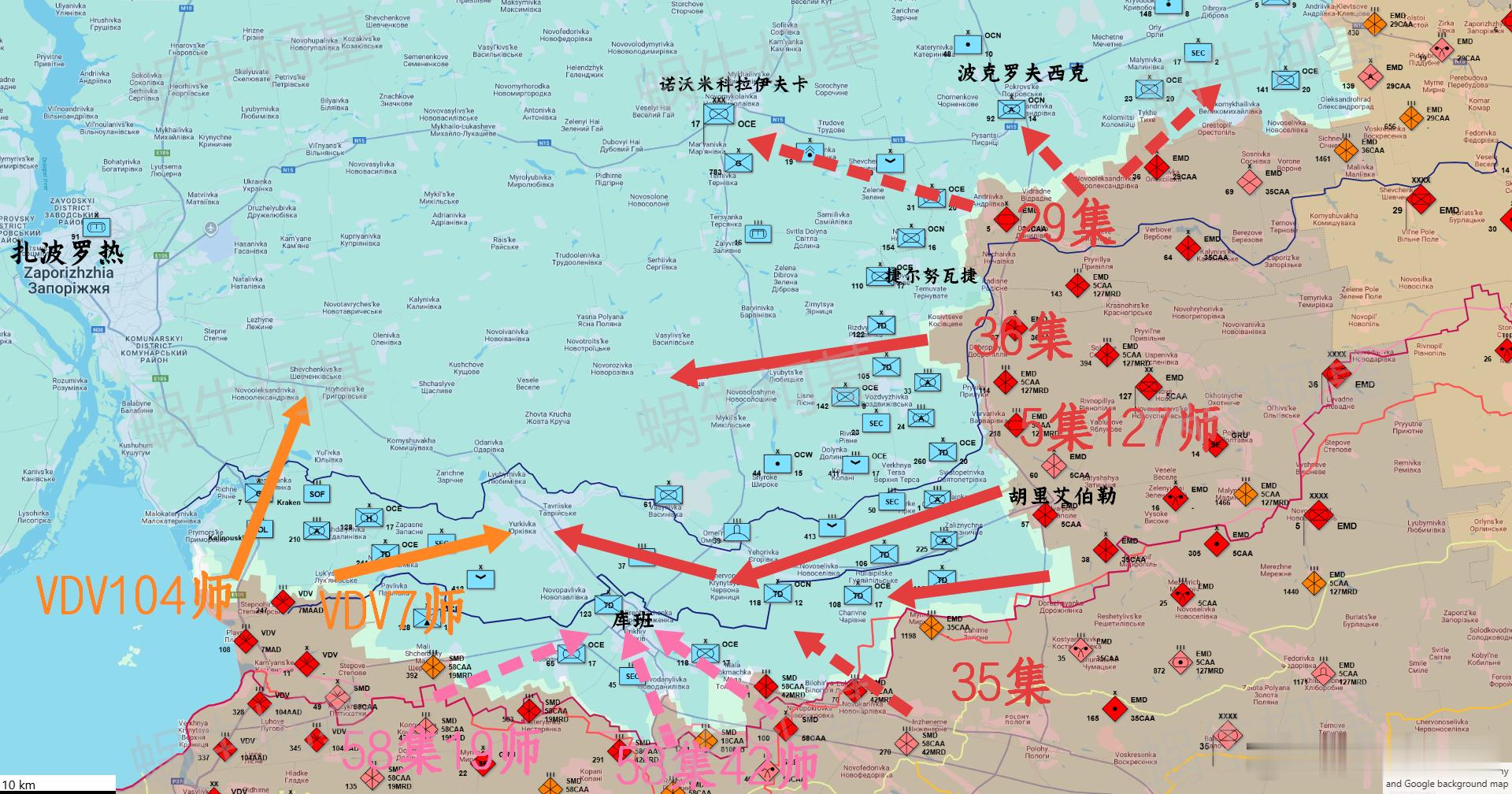 俄军南线进攻范式拆解:上段目标是切断体系,VDV104师向北突破扎卢日内第二防线,36集向西切断乌军17军纵向联络,是把第二防线从体系防线降级成孤立工事。中段目标是完成会师,老牌的VDV7师和新晋王牌5集127师平行第一防线北沿,从两端向库班北郊靠拢,堵住17军退路,一旦完成会师,战役达成80%,完全孤立乌军各集团。下段目标是持续施压,这个由58集和35集完成,适当攻坚突击,黏住库班集团,和牵制波克罗夫西克的29集任务一样。不过一旦库班北郊会师,这边就会发起清理,整个战役完成。这个范式的灵魂就是扎卢日内防线,观察一下俄军目前的突出部,就知道未来最重要的中段是沿着防线打,因为乌军防线已经把道路、桥梁、补给节点、工程能力全都配置好了,怎么修路、怎么走车、怎么堆物资,俄军只需要照着这个模板反向复刻一遍即可。这不是灵感,这是寄生式作战,充分利用对手战略投资进行体系性套利。俄乌局势新进展普京称已无兴趣等乌方从占领区撤出 俄乌部署图
